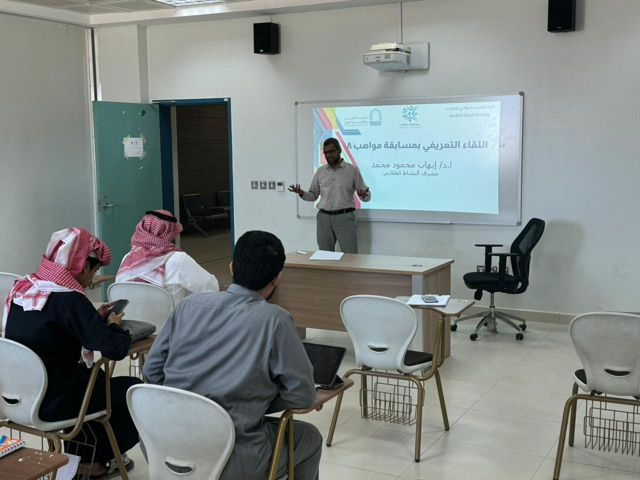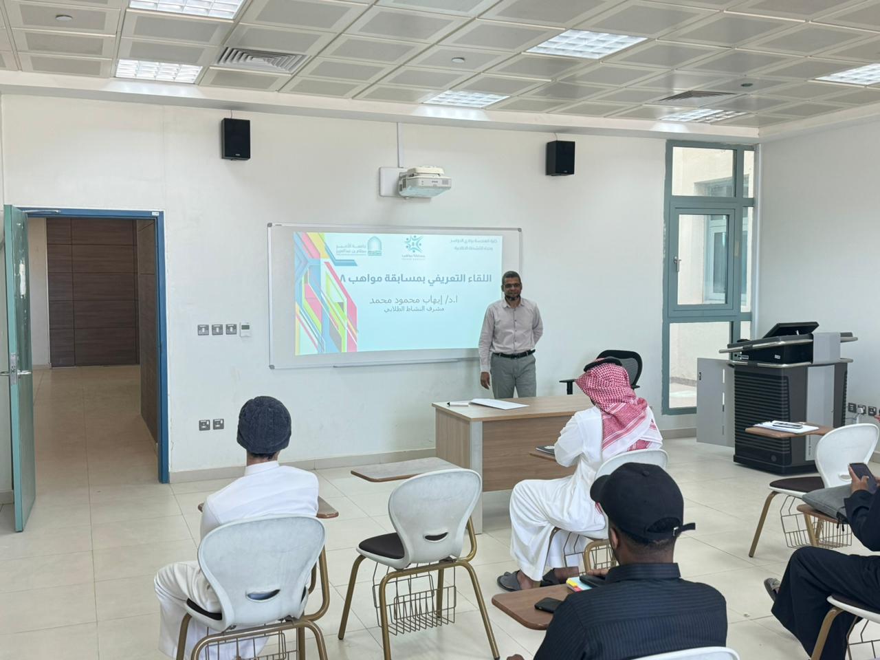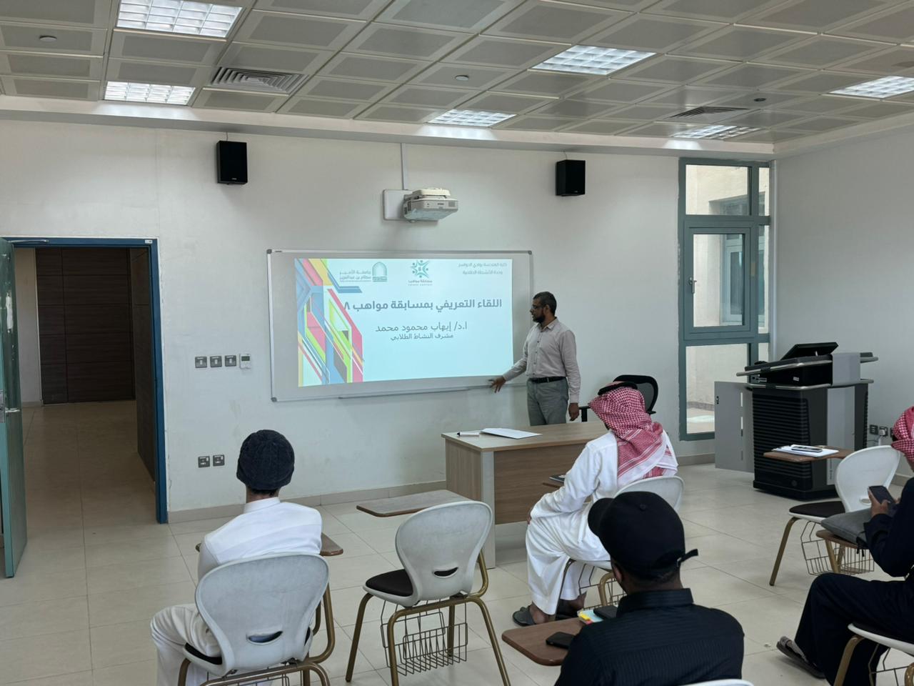 عقدت لجنة الأنشطة الطلابية يوم الاثنين الموافق ٢-٨-١٤٤٥ لقاء تعريفي للطلاب عن مسابقة مواهب ٨. هذا وقد أدار اللقاء  ا.د / إيهاب محمود مشرف النشاط الطلابي في الكلية وكان الحضور حوالي ١٢ طالب.