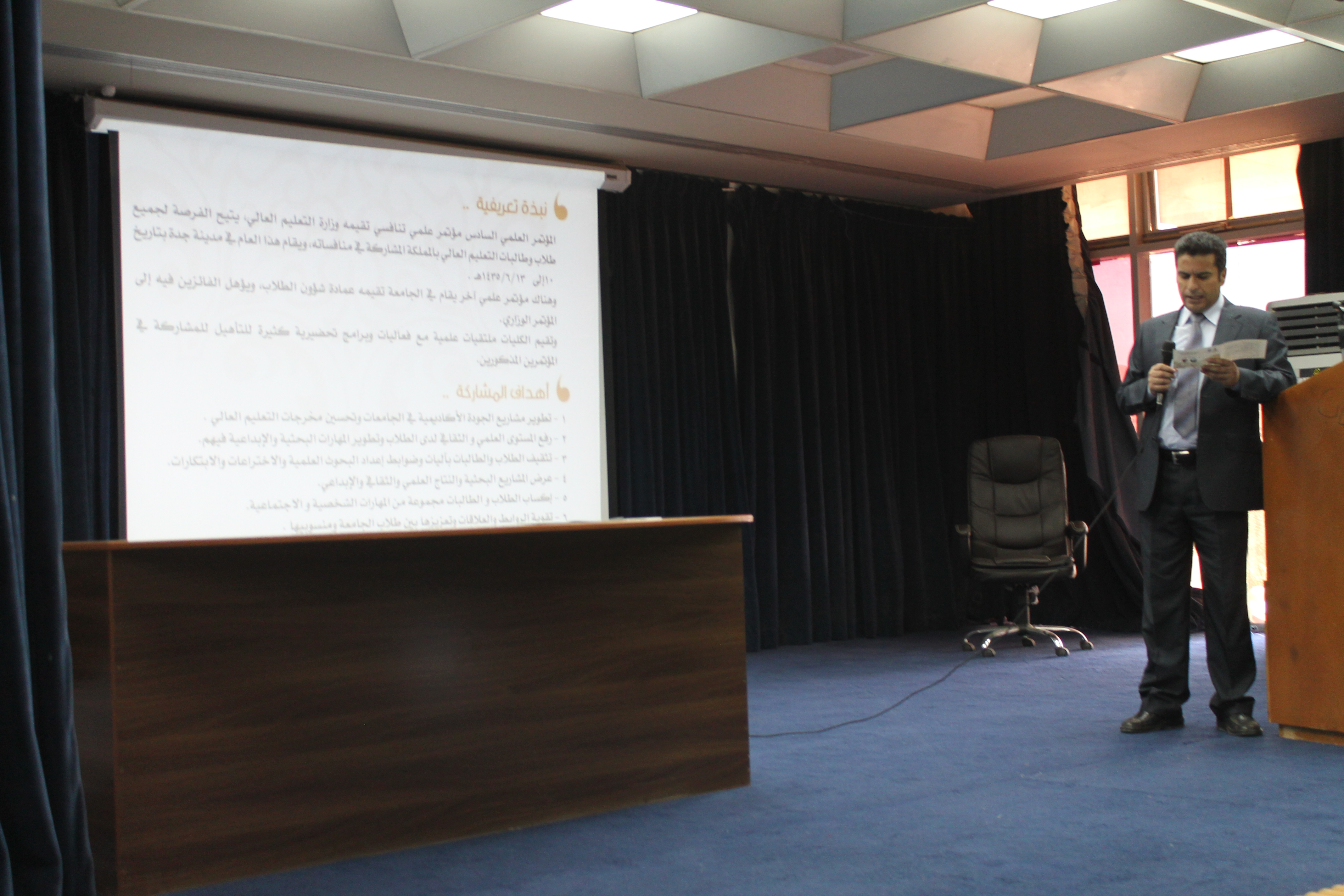 برعاية سعادة عميد كلية الهندسة بوادي الدواسر الدكتور مجاهد بن محمد آل ضيف الله نظمة الكلية لقاءً تعريفياً بالمؤتمر العلمي السادس لطلاب وطالبات التعليم العالي بالمملكة . حيث ألقي الدكتور عمر عبدلله رئيس قسم الهندسة الكهربائية كلمة ترحيب بالطلبة الحضور حثهم فيها على أهمية المشاركة في المؤتمر العلمي السادس محفزاً الطلاب من خلال بيان أهمية البحث العلمي وأثره على الفرد والمجتمع ، شاكراً القائمين على الأعمال المشاركة منوهاً بالجهود المبذولة من قبل اللجان المعنية بالمؤتمر . بعد ذلك قام الدكتور يوسف درادكة منسق شؤون الطلاب و منسق المؤتمر بالكلية كلمة بالشرح المستفيض لكل محاور وجوانب المؤتمر العلمي السادس وآلية تسليم المشاركات وضوابط تقييمها ودور المنسقين بالكليات واللجان المعنية .