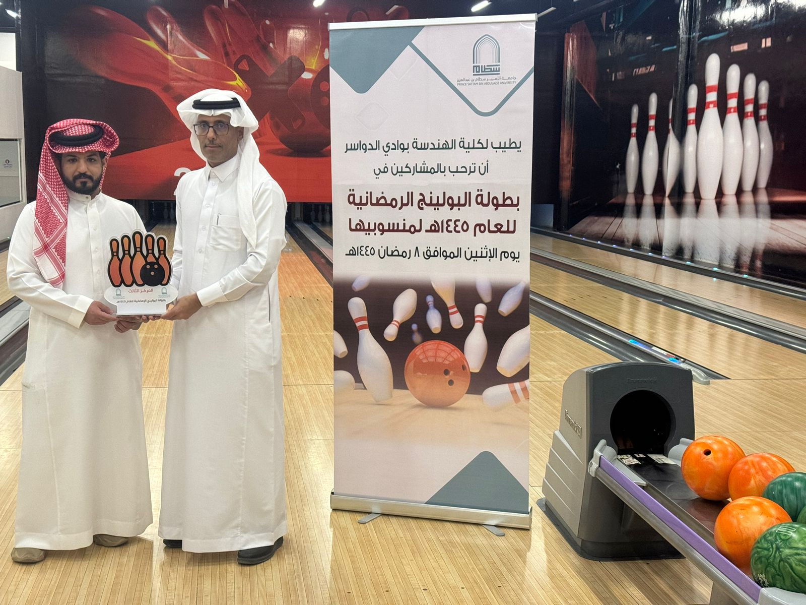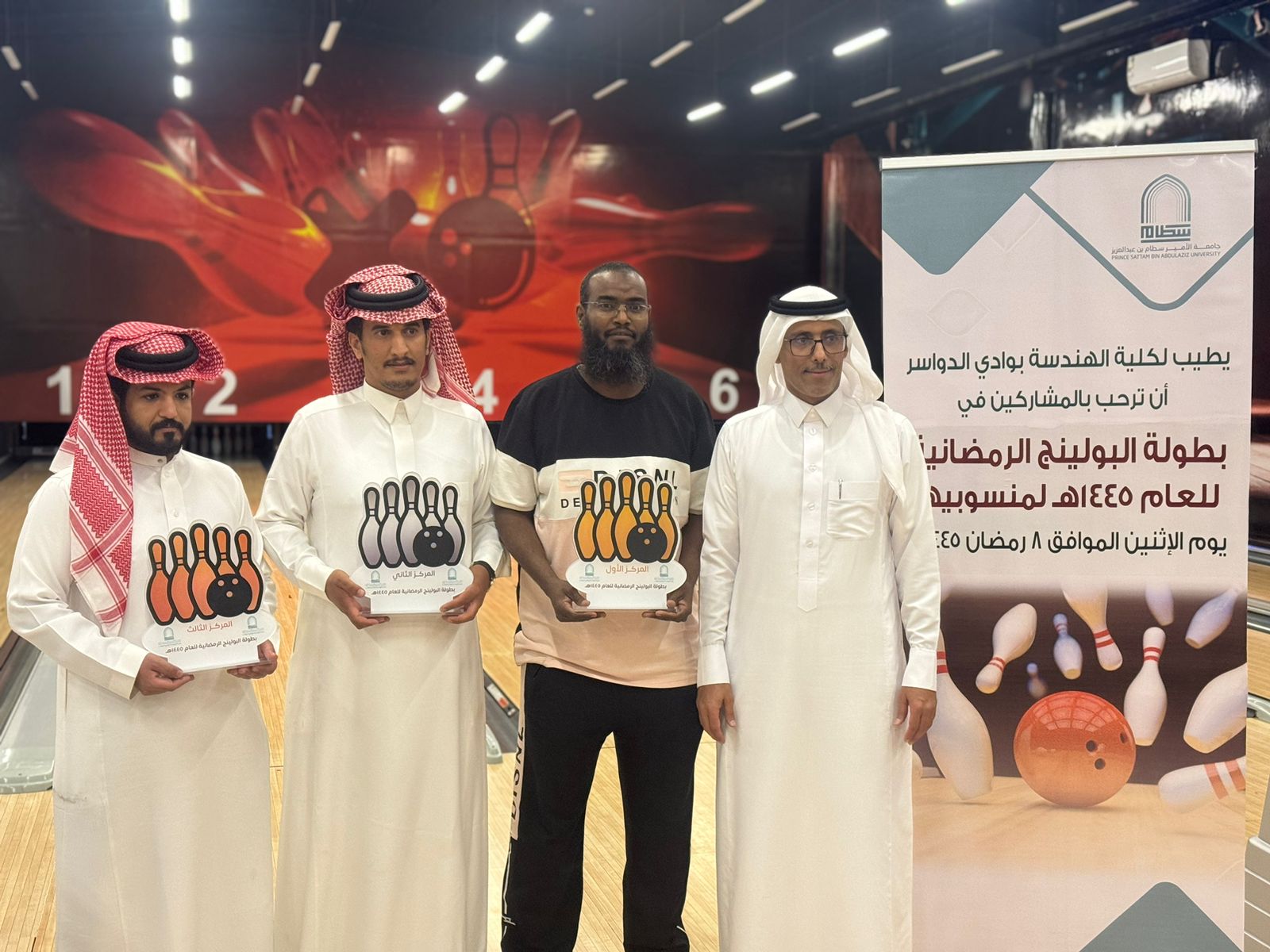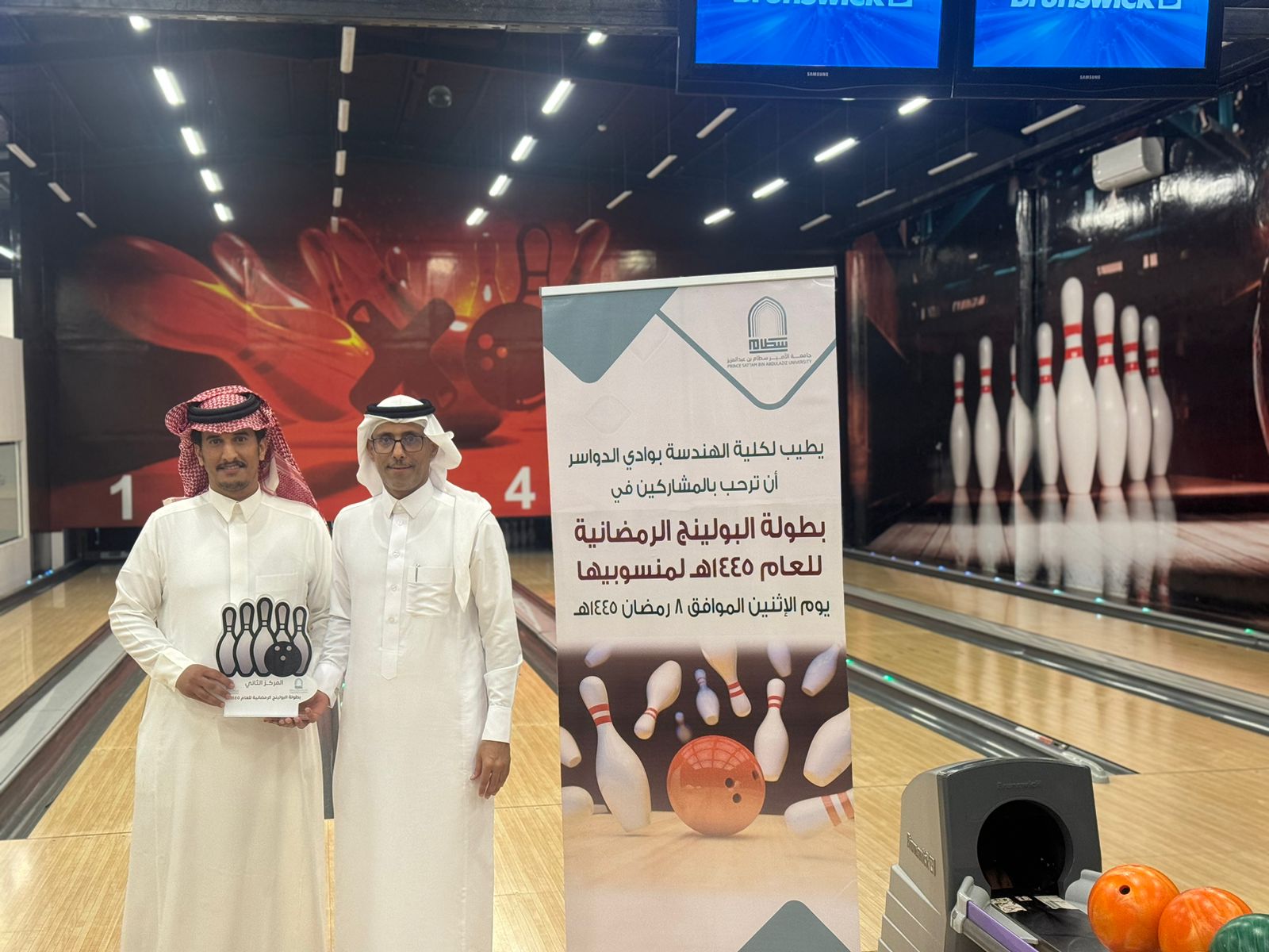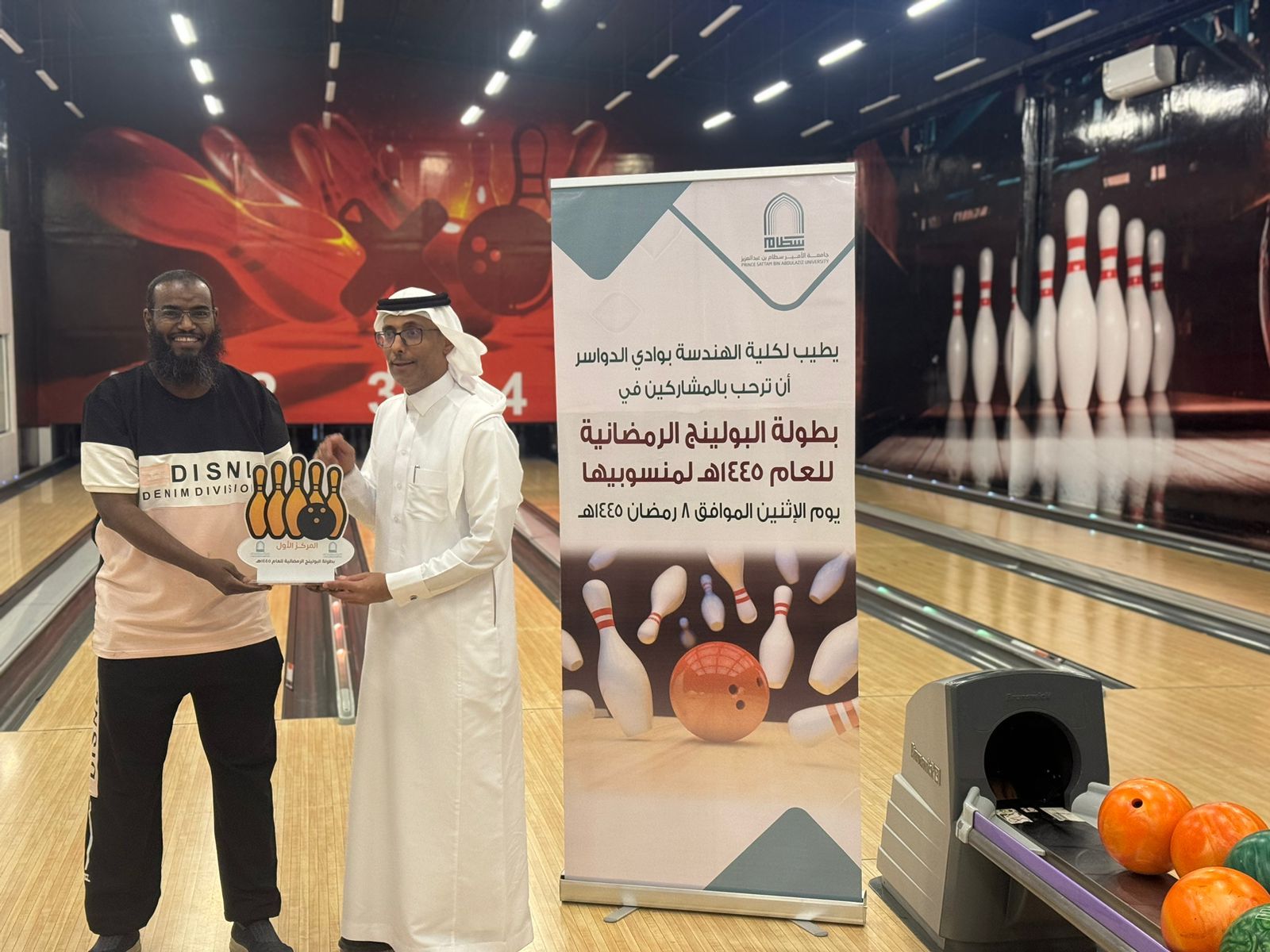 ضمن الفعاليات والأنشطة التي تقيمها كلية الهندسة بوادي الدواسر أقامت الكلية بطولة البولينج الرمضانية لمنسوبي الكلية في مركز XO Gaming Club للبولينج في المحافظة يوم الاثنين 08/09/1445هـ، حيث شهدت البطولة مشاركة عميد الكلية الدكتور/ محمد الحيدر ووكيل الكلية للشؤون التعليمية والأكاديمية الدكتور/ عبيد بن مرثع الدوسري وعدد من أعضاء هيئة التدريس والموظفين في وسط أجواء حماسية وأخوية بين المشاركين.
