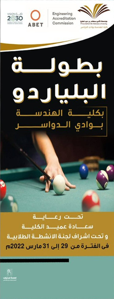 تحت رعاية عميد الكلية وبإشراف لجنة الأنشطة الطلابية بالكلية أختمت اليوم الثلاثاء الموافق 1443/08/26 فعاليات الدور التمهيدي من بطولة البلياردو المقامة في جناح الأنشطة الطلابية في كلية العلوم والآداب بوادي الدواسر. على أن تقام الادوار النهائية وتسليم الجوائز يوم الخميس القادم بمشيئة الله تعالى.
