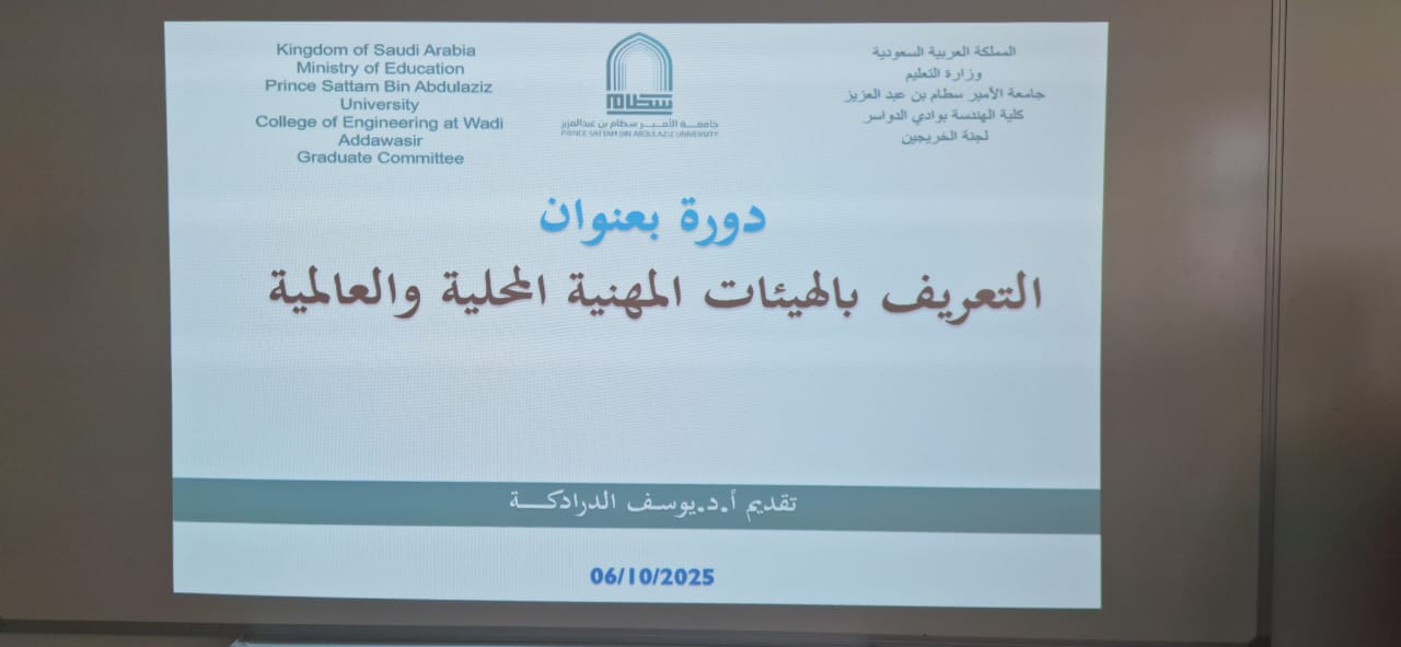 في إطار تعزيز قدرات الطلاب وتأهيلهم لمتطلبات سوق العمل، أقامت لجنة الخريجين ممثلةً بمجال الارشاد المهني دورة بكلية الهندسة بعنوان "التعريف بالهيئات المهنية المحلية والعالمية"، قدمها الأستاذ الدكتور يوسف الدرادكـــة، الأستاذ بقسم هندسة الحاسب والمعلومات وذلك يوم الإثنين الموافق6/10/2025. حيث تناول خلالها أهمية الهيئات المهنية المحلية والعالمية للخريج، مسلطاً الضوء على أهداف الهيئات المهنية وأهم عشرة هيئات محلية وعالمية، والانخراط في برامجها وأنشطتها لتحصيل المعرفة واكتساب المهارات المطلوبة. استهدفت الدورة طلاب الكلية الخريجين والمتوقع تخرجهم إلى تعريف الطلبة بالهيئات المهنية وأهميتها، مواكبة التطورات والتوجهات، استكشاف الفرص المحلية والعالمية. وسعت إلى تزويدهم بالمعلومات اللازمة بتتبع التطورات والتوجهات, تقدير المزايا والفوائد, استكشاف الفرص العالمية والمحلية. وقد شهدت الدورة تفاعلاً ملحوظاً من الطلاب، مما يعكس اهتمامهم الكبير بهذه الهيئات المهنية. كما أثمرت الدورة عن تعزيز وعي الطلاب بأهمية الهيئات المهنية كمسار مهني واعد في التخصصات الهندسية. وأكدت الكلية على أهمية استمرارية تنظيم مثل هذه الدورات لتعزيز المعرفة بهذه الهيئات بين طلابها وتشجيعهم على مواكبة التطورات والانخراط في الهيئات المهنية يمنح الطلبة ميزة تنافسية في سوق العمل، ويمكنهم من بناء مسيرة مهنية ناجحة تلبي طموحاتهم المستقبلية. الجدير بالذكر أن الدورة شهدت حضور ١٨ طالباً، واشتملت على مناقشات مثمرة أجابت على استفساراتهم، مما أضفى طابعاً تفاعلياً ومفيداً على فعالياتها.