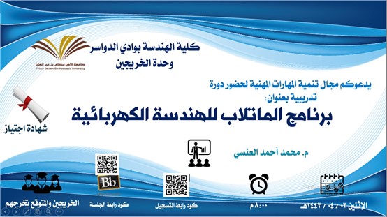 قامت لجنة الخريجين ممثلة بمجال تنمية المهارات المهنية بكلية الهندسة بوادي الدواسر بعقد دورة بعنوان برنامج الماتلاب للهندسة الكهربائية (عن بُعد) وذلك يوم الأربعاء بتاريخ 03/04/1443 الموافق 08/11/2021 وكانت الدورة موجهة للخريجين والمتوقع تخرجهم. قدم الدورة سعادة المهندس محمد أحمد العنسي ، محاضر بقسم الهندسة الكهربائية. هدفت الدورة إلى رفع مهارات الطلاب في استخدام برنامج الماتلاب لمحاكاة أنظمة و تطبيقات الهندسة الكهربائيه. وفي الختام تتقدم وحدة الخريجين بكلية الهندسة بوادي الدواسر بجزيل الشكرًوالتقديرً لسعادة المهندس محمد العنسي على تقديمه هذه الدورة وندعوً له بدوام التوفيق والسداد.