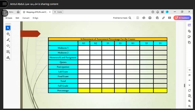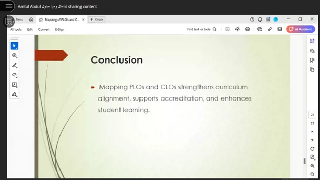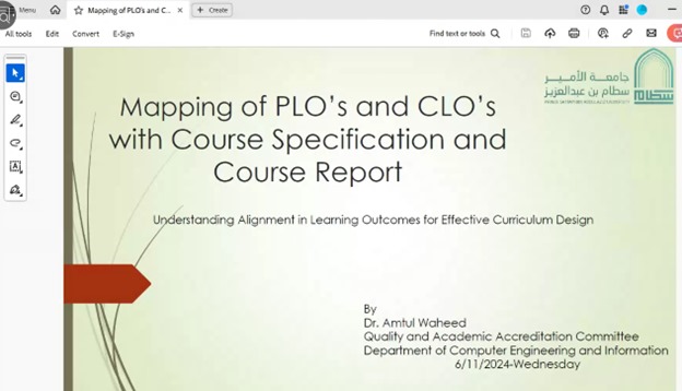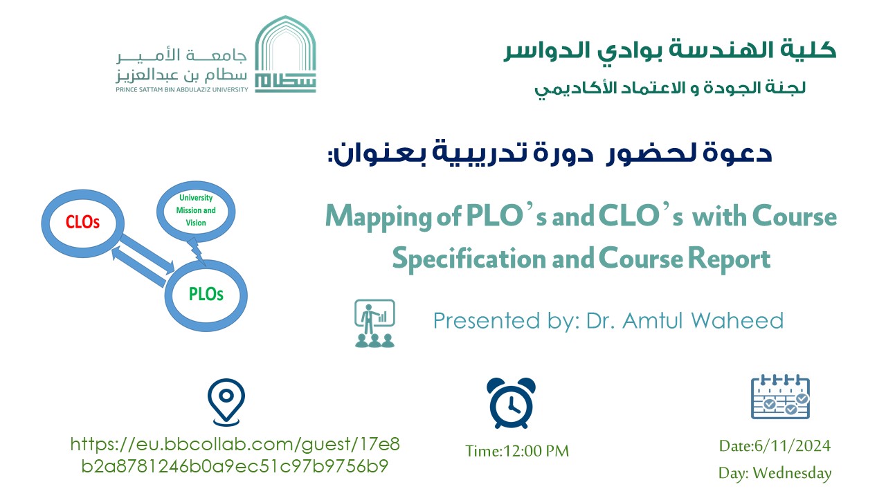 عقدت لجنة الجودة والاعتماد الأكاديمي، بقسم هندسة الحاسب والمعلومات، كلية الهندسة بوادي الدواسر، دورة بعنوان "مواءمة مخرجات التعلم للبرنامج (PLOs) ومخرجات التعلم للمقرر (CLOs) مع مواصفات المقرر وتقرير المقرر"، وذلك يوم الأربعاء 6/11/2024، قدمتها الدكتورة أمتل وحيد، محاضرة في قسم هندسة الحاسب والمعلومات. بدأت الورشة الساعة 12:00 ظهرًا عبر منصة البلاكبورد (أونلاين).