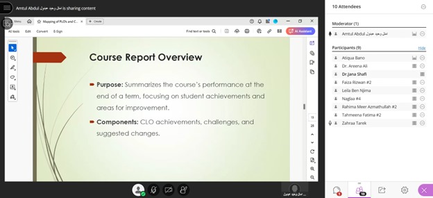 حضر الورشة أعضاء هيئة التدريس من مختلف الأقسام، وكانت الجلسة تفاعلية، واستفاد منها جميع الحاضرين. كانت ردود الفعل من الحضور ممتازة، مما يشير إلى أن معظم الأعضاء استوعبوا محتوى الورشة