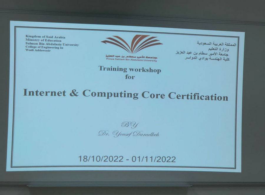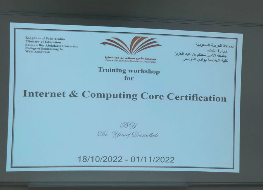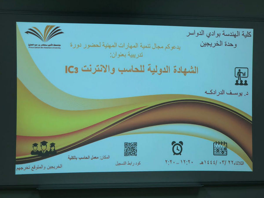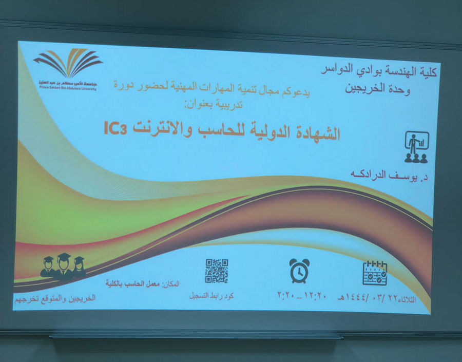 قامت لجنة الخريجين ممثلة بمجال تنمية المهارات المهنية بكلية الهندسة بوادي الدواسر بالتعاون مع لجنة شؤون الطلاب بعقد دورة تدريبية بعنوان الشهادة الدولية للحاسب والإنترنت IC3 بالكلية وذلك يوم الثلاثاء الموافق 18/10/ 2022م. قدم الدورة سعادة الدكتور يوسف إبراهيم درادكه الأستاذ المشارك في قسم هندسة الحاسب الآلي والشبكات. تهدف الدورة إلى إعداد الخريج لاجتياز الاختبارات المطلوبة للحصول على الشهادة الدولية للحاسب والإنترنت. IC3