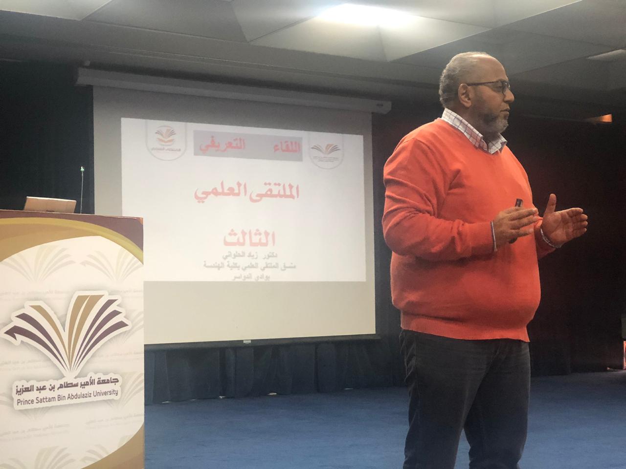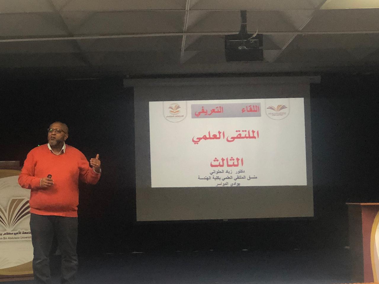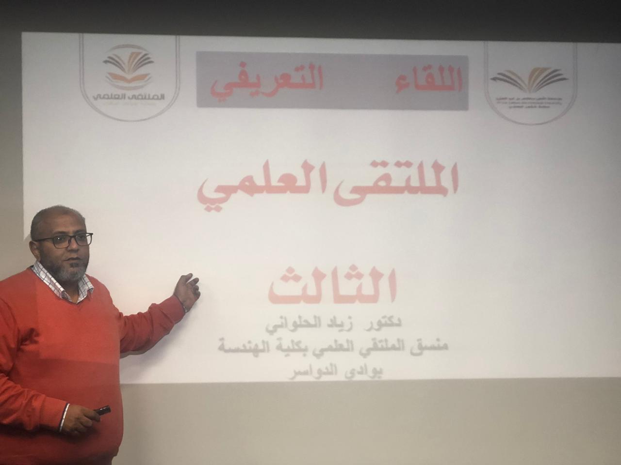 تمت بحمد الله فاعليات اللقاء التعريفي الخاص بالملتقي العلمي الثالث في رحاب كلية الهندسة بوادي الدواسر بحضور لفيف من السادة اعضاء هيئة التدربس و الإداريين و حضور كبير ومشاركة فعاله من طلاب الكلية و اللقاء التعريفي تناول بشكل مفصل الرؤية و الاهداف و محاور الملتقى الخمس و استعرض الجوائز المقدمة من قبل الامانة العامة للملتقى بجامعة الامير سطام بن عبد العزيز. قدم اللقاء و العرض التفصيلي د. زياد الحلواني منسق عام الملتقى بكلية الهندسة بوادي الدواسر و برعاية كريمة من السيد الدكتور مجاهد محمد آل ضيف - عميد الكلية الذي قدم كل الدعم لإنجاح الفعاليات كما قام ايضاً بتحفيز الطلاب على تقديم ابداعاتهم و مشاركاتهم في الملتقى.