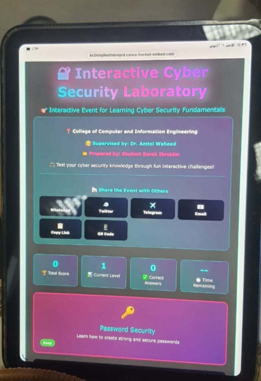 شهدت الفعالية حضورًا مميزًا وتفاعلًا كبيرًا من الطالبات وأعضاء هيئة التدريس والإداريات، حيث تمت مناقشة مفاهيم الأمن السيبراني وطرق الوقاية من المخاطر الإلكترونية بأسلوب توعوي وتطبيقي.