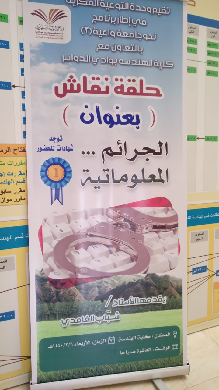 تقيم وحدة التوعية الفكرية في إطار برنامج نحو جامعة واعية (3) بالتعاون مع كلية الهندسة بوادي الدواسر حلقة نقاش بعنوان الجرائم المعلوماتية يقدمها الأستاذ شباب الغامديالمكان : كلية الهندسة بوادي الدواسرالزمان: الأربعاء 6/3/1440هـالوقت : العاشرة صباحاتوجد شهادات للحضور