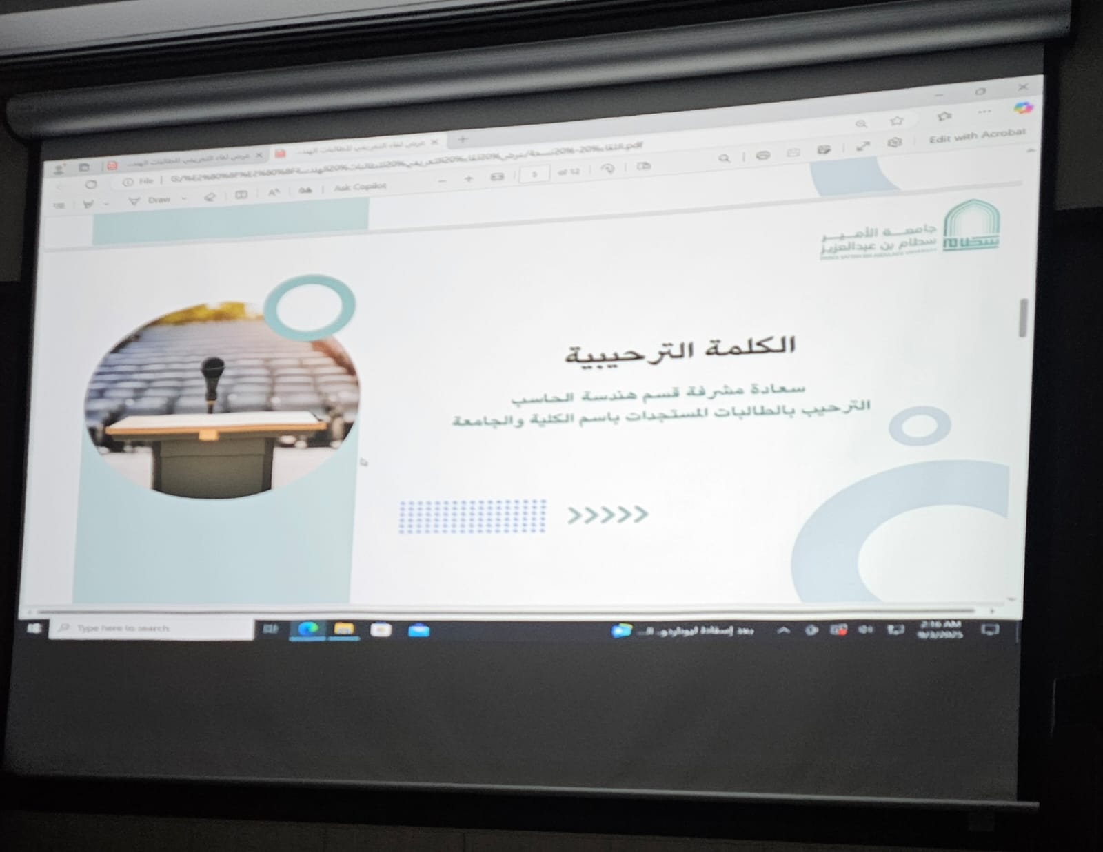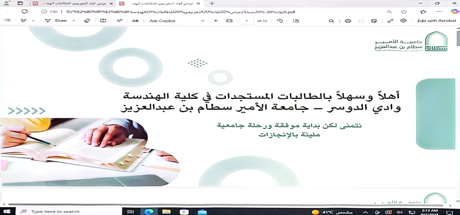 في إطار حرصها على تهيئة الطالبات المستجدات للانخراط في الحياة الجامعية، نظّمت كلية الهندسة بوادي الدواسر – شطر الطالبات فعالية "اللقاء التعريفي للطالبات المستجدات"، وذلك يوم الأربعاء 11/3/1447 هــ الموافق 3 سبتمبر 2025 م في تمام الساعة الثانية عشرة ظهرًا بمقر الكلية.