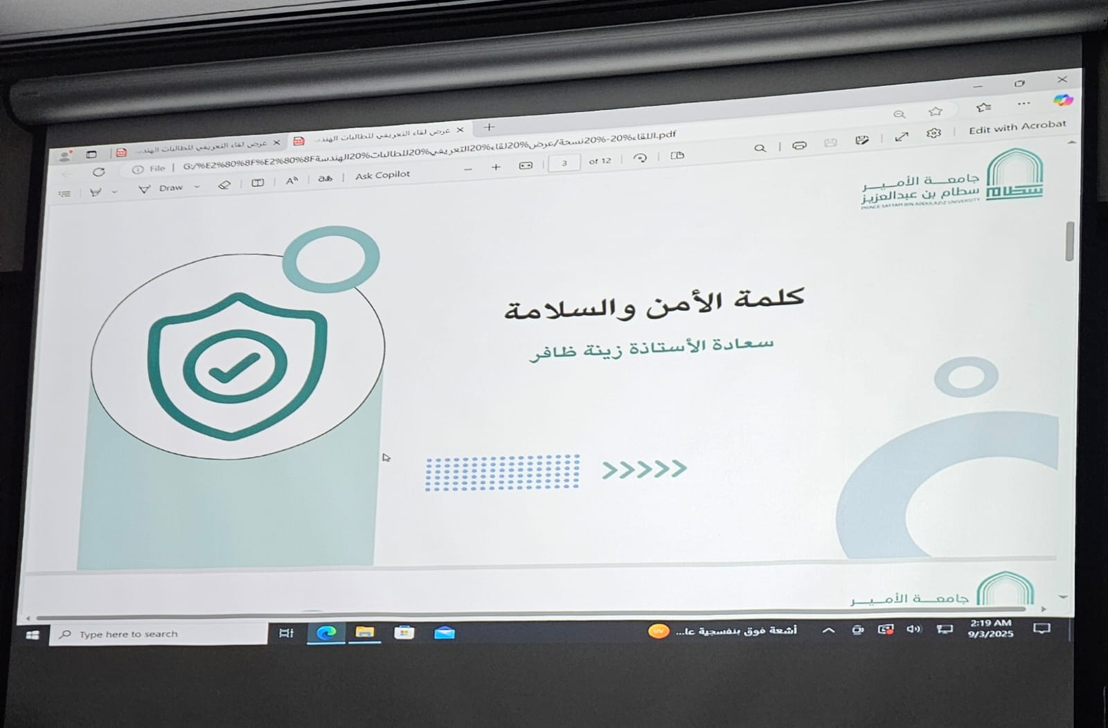 كما شهد اللقاء فقرة توعوية عن الأمن والسلامة قدمتها الأستاذة زينة ظافر، أوضحت خلالها الإرشادات والاحتياطات الواجب اتباعها لضمان بيئة جامعية آمنة لجميع الطالبات.