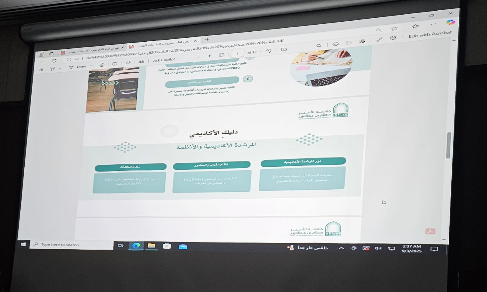 تضمّن اللقاء مجموعة من الفقرات التعريفية التي هدفت إلى تعريف الطالبات بمرافق الكلية وأقسامها الأكاديمية، بالإضافة إلى توضيح الأنظمة واللوائح الجامعية والخدمات المقدمة لهن. وقدمت الدكتورة ليلى الهادي، منسقة قسم هندسة الحاسب، عرضًا تفصيليًا تناولت فيه محاور العملية الأكاديمية، الإرشاد الأكاديمي، الخطة الدراسية، والتخصصات المتاحة.