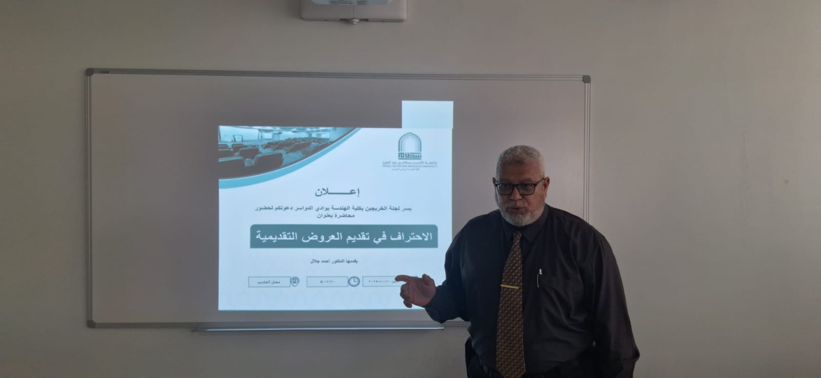 قدّم الدورة سعادة الدكتور أحمد جلال، الأستاذ المشارك بقسم الهندسة الميكانيكية، حيث تناول خلالها أهم الأسس والاستراتيجيات لإنشاء عروض تقديمية فعّالة، مع التركيز على تصميم الشرائح الجذابة، واستخدام العناصر البصرية، وتطبيق تقنيات الإلقاء المتميز التي تعزز من تأثير العرض.