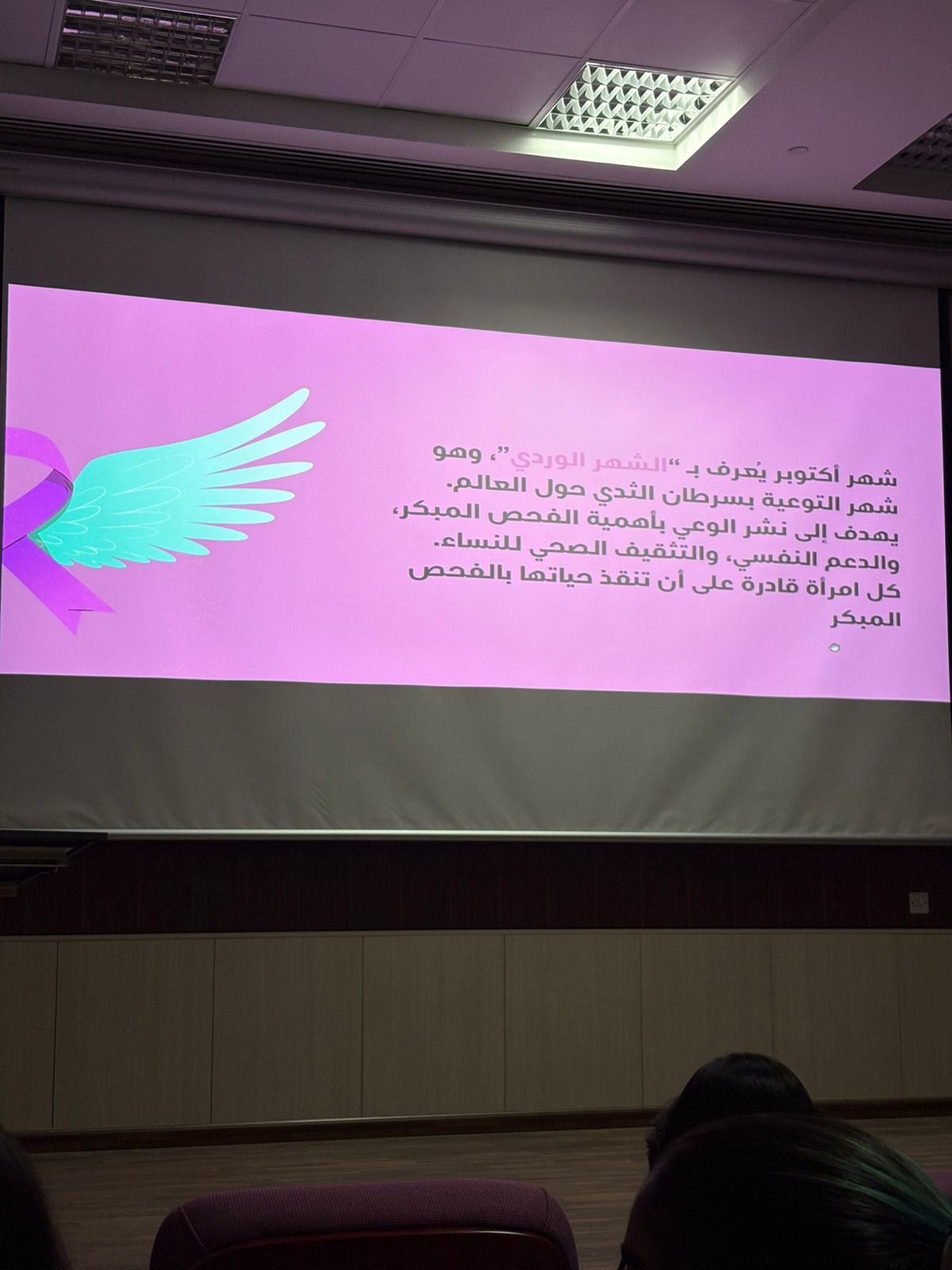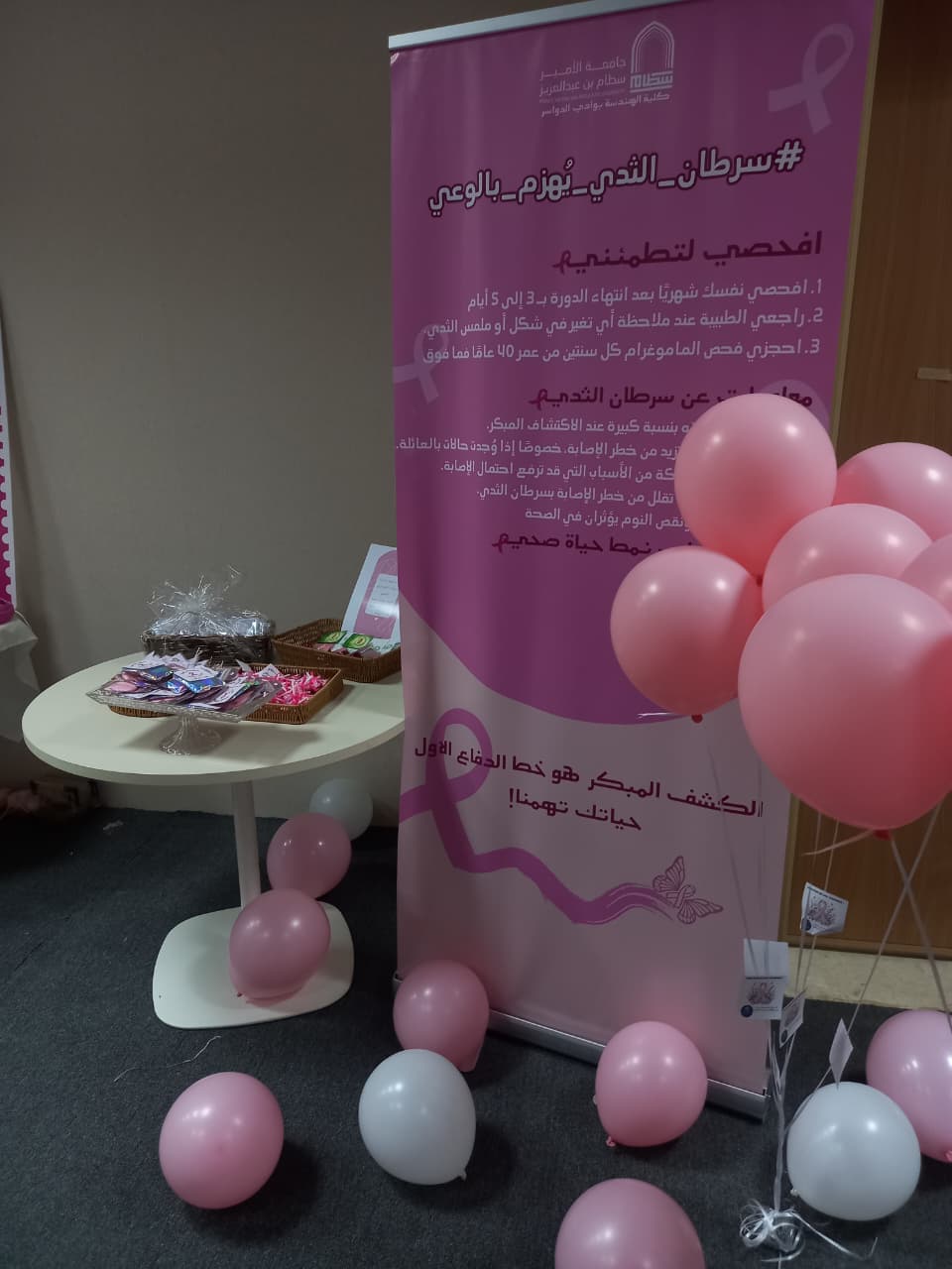 في إطار شهر أكتوبر، شهر التوعية العالمي بسرطان الثدي، نظّمت كلية الهندسة بوادي الدواسر – شطر الطالبات فعالية بعنوان "التوعية بسرطان الثدي"، وذلك يوم الأربعاء الموافق 29 أكتوبر 2025، بإشراف وحدة العمل الطلابي ولجنة خدمة المجتمع.