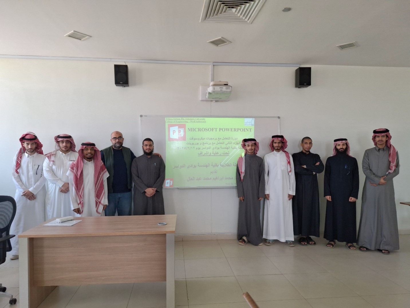 في إطار تطوير المهارات التقنية لطلابها، نظّمت لجنة الأنشطة الطلابية بالتعاون مع لجنة الخريجين بكلية الهندسة في وادي الدواسر، يوم الأربعاء 12 فبراير 2025، دورة تدريبية بعنوان "التعامل مع برمجيات ميكروسوفت باحترافية – الجزء الثاني: ميكروسوفت بوربوينت".