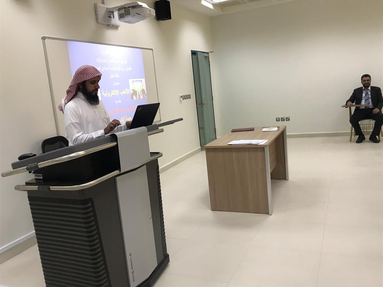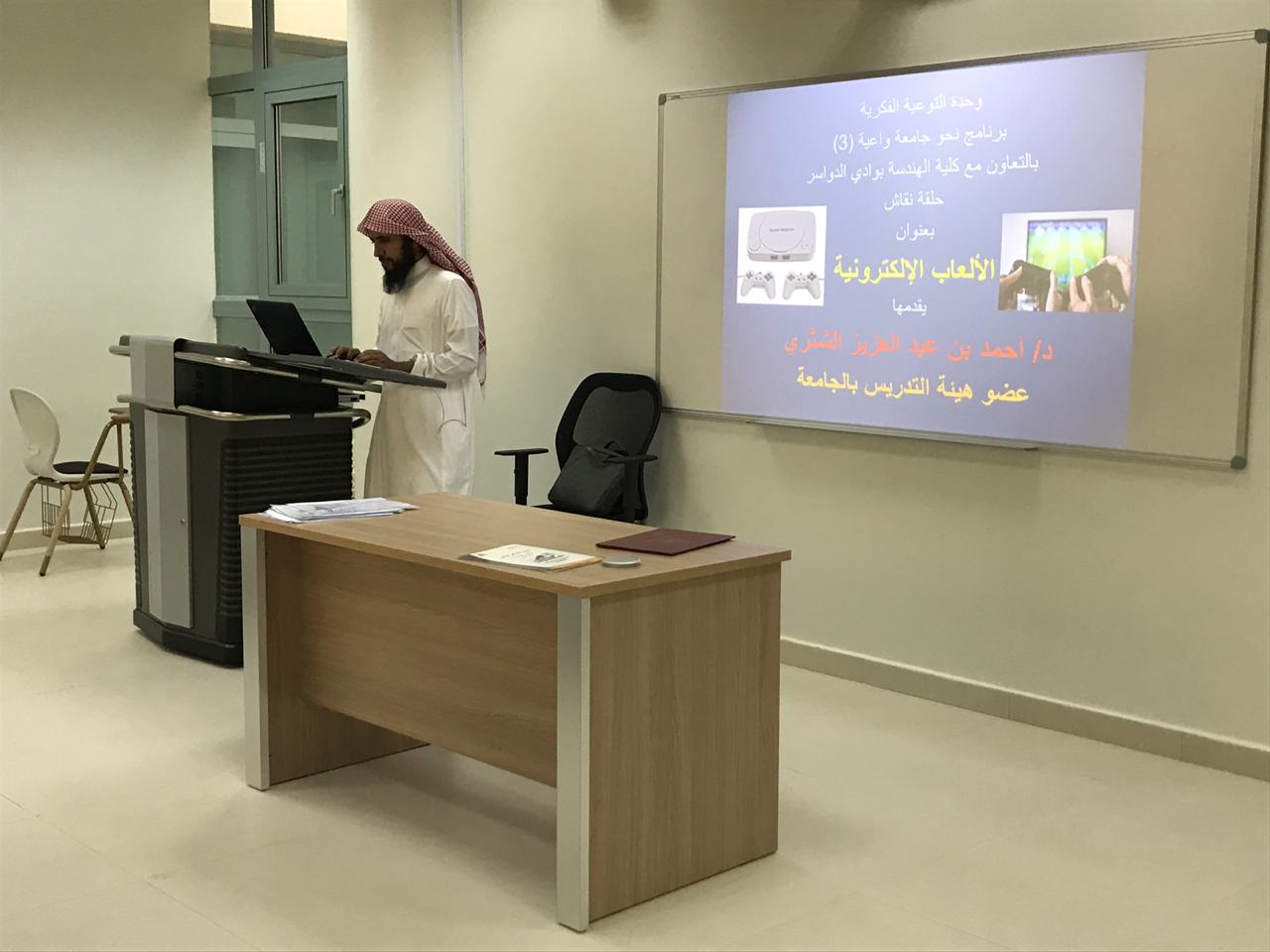 عدسة و تحرير: موفي الهذابتحت رعاية معالي مدير جامعة الأمير سطام بن عبد العزيز أقامت كلية الهندسة بوادي الدواسر ، يوم الأربعاء الموافق : ١٤٤٠/٦/٨ هجري وفي تمام الساعة العاشرة صباحاً حلقة نقاش بعنوان : ( الالعاب الإلكترونية) وذلك ضمن إطار مشروع نحو جامعة واعية ٣ بالتعاون مع وحدة التوعية الفكرية بالجامعة .وكانت من إعداد وتقديم الدكتور/ أحمد بن عبد العزيز الشثري ،وتمحور النقاش حول الألعاب عامة والألعاب الألكترونية خاصة من حيث ١- اللعب هل هو حلال ام حرام .. ؟▪أمثلة لبعض الالعاب المحرمة في الاسلام .٢- ما هي الالعاب الالكترونية ..؟▪ أمثلة لبعض الالعاب الالكترونية التي تم حظرها في المملكة .٣- مضار الالعاب الالكترونية على الأطفال .وقد تخلل الجلسة المناقشات الجوهرية والعروض بيانية والمشاركات الطلابية بحضور الدكتور / محمد مسعود الحيدر ، وكيل الكلية للتطوير والجودة ونخبة من أعضاء هيئة التدريس وعدد من الطلاب وصل إلى (٢٢) طالب من طلاب كلية الهندسةوفي الختام شكر الدكتور / محمد مسعود الحيدر ، وكيل الكلية للتطوير والجودة بالنيابة عن إدارة كلية الهندسة ، الدكتور / خالد بن إبراهيم الدبيان على تكبده مشاق السفر وحضوره للوادي الدواسر لإفادة أبنائه الطلاب، ورفع مستوى الوعي الفكري لديهم كما قدّم له شهادة شكر وتقدير عرفاناً لمجهوده المقدّر.