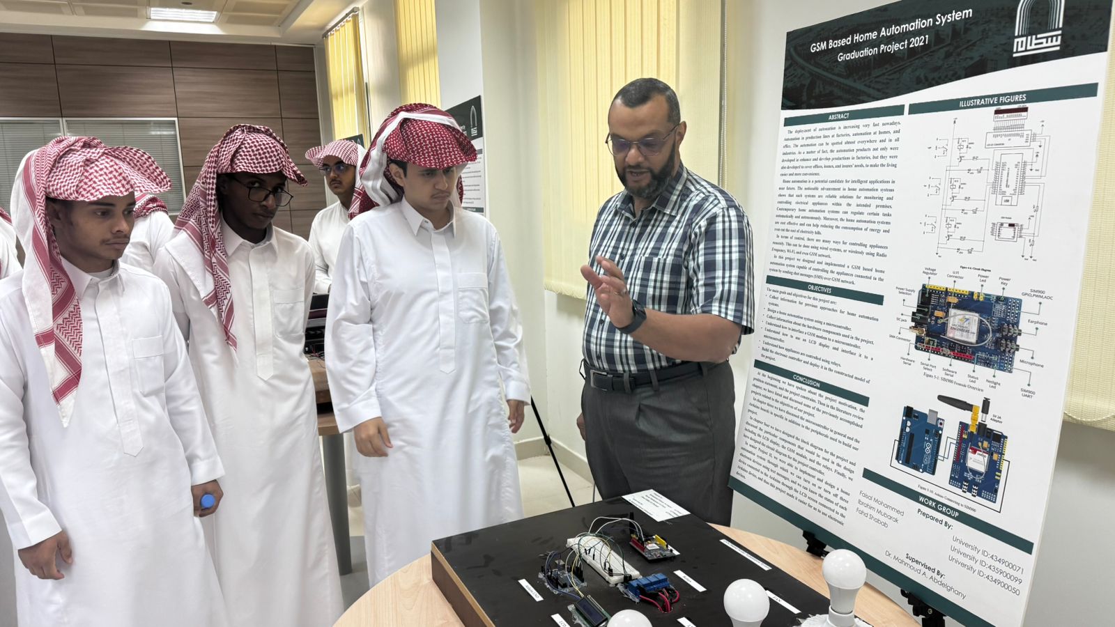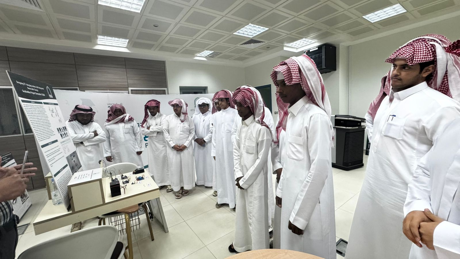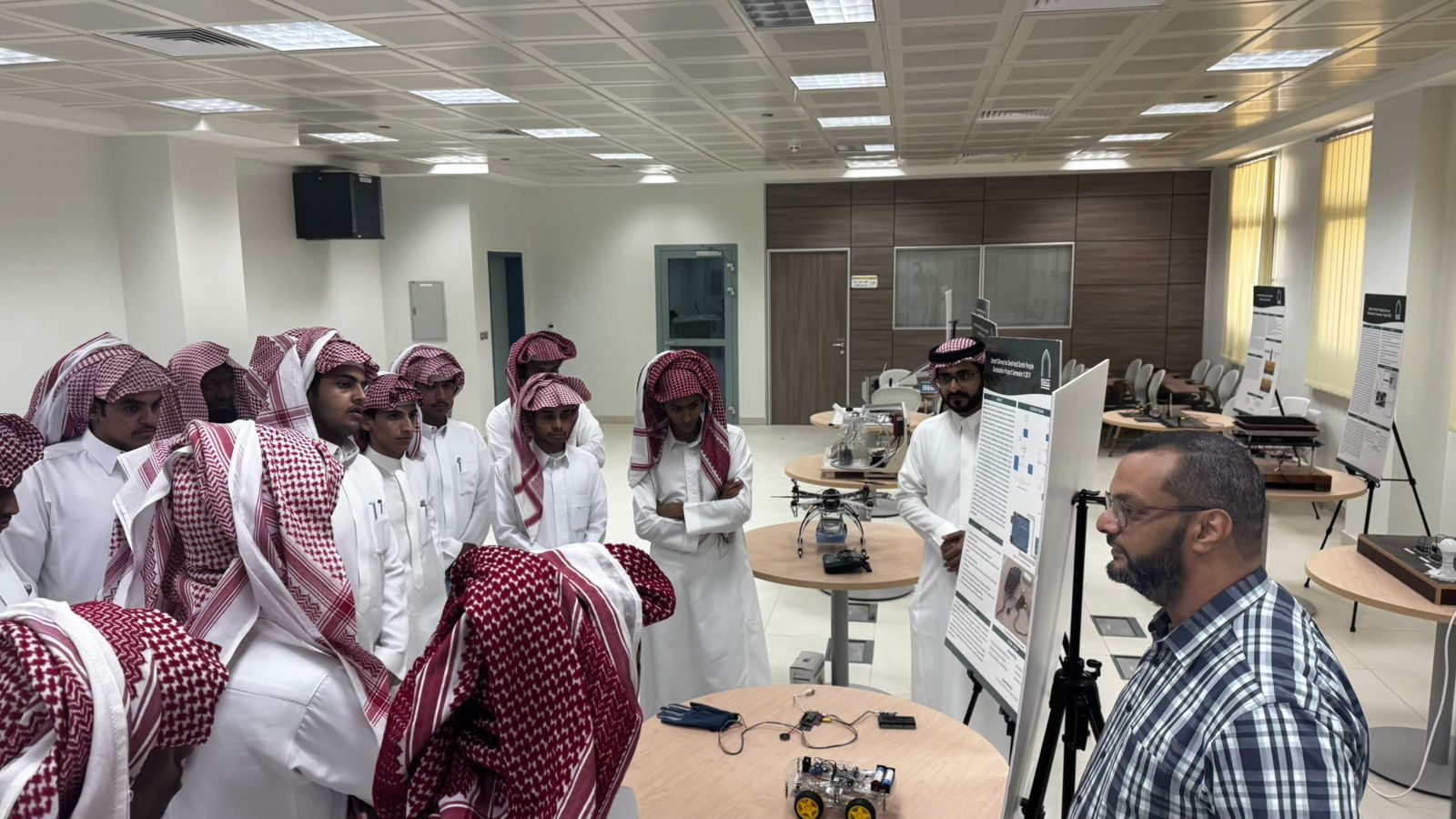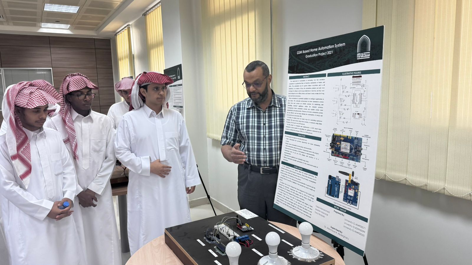 عقب ذلك، قامت الكلية بتنظيم جولة تعريفية للطلاب داخل معاملها ومرافقها، حيث اطلعوا خلالها على مجموعة من مشاريع التخرج المتميزة التي أنجزها طلاب الكلية. وقد تولّى سعادة الدكتور محمود عبدالغني تقديم شرح وافٍ عن هذه المشاريع، مبينًا فكرة كل مشروع وآلية تنفيذه والأثر المتوقع منه، مما أضفى على الزيارة طابعًا عمليًا محفزًا للطلاب الزائرين.