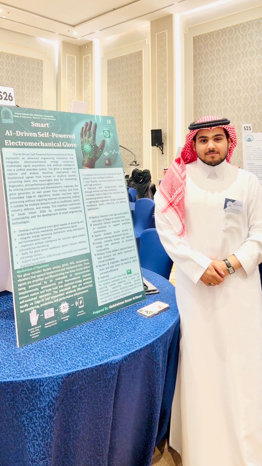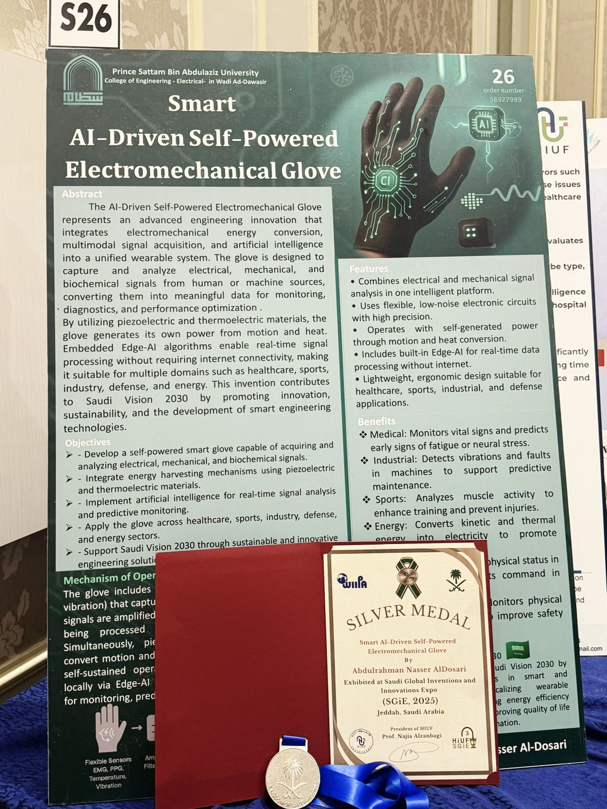 وفي إطار مشاركة كلية الهندسة بوادي الدواسر في هذا الحدث الدولي، حقق الطالب عبدالرحمن ناصر الدوسري من قسم الهندسة الكهربائية إنجازًا مشرفًا بحصوله على الميدالية الفضية عن ابتكاره (Smart AI-Driven Self-Powered Electromechanical Glove)، في إنجاز يعكس مستوى الإبداع والتميز الذي يقدّمه طلاب الكلية، ويمثل ثمار الدعم الأكاديمي والبحثي الذي توليه الكلية لطلبتها.