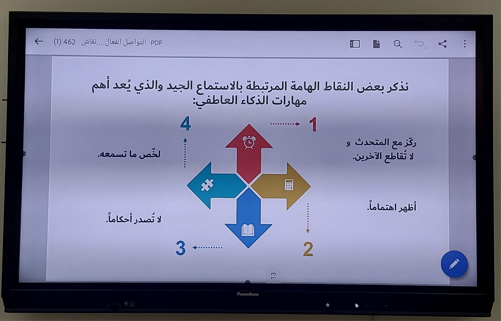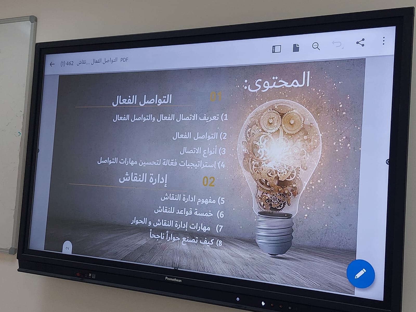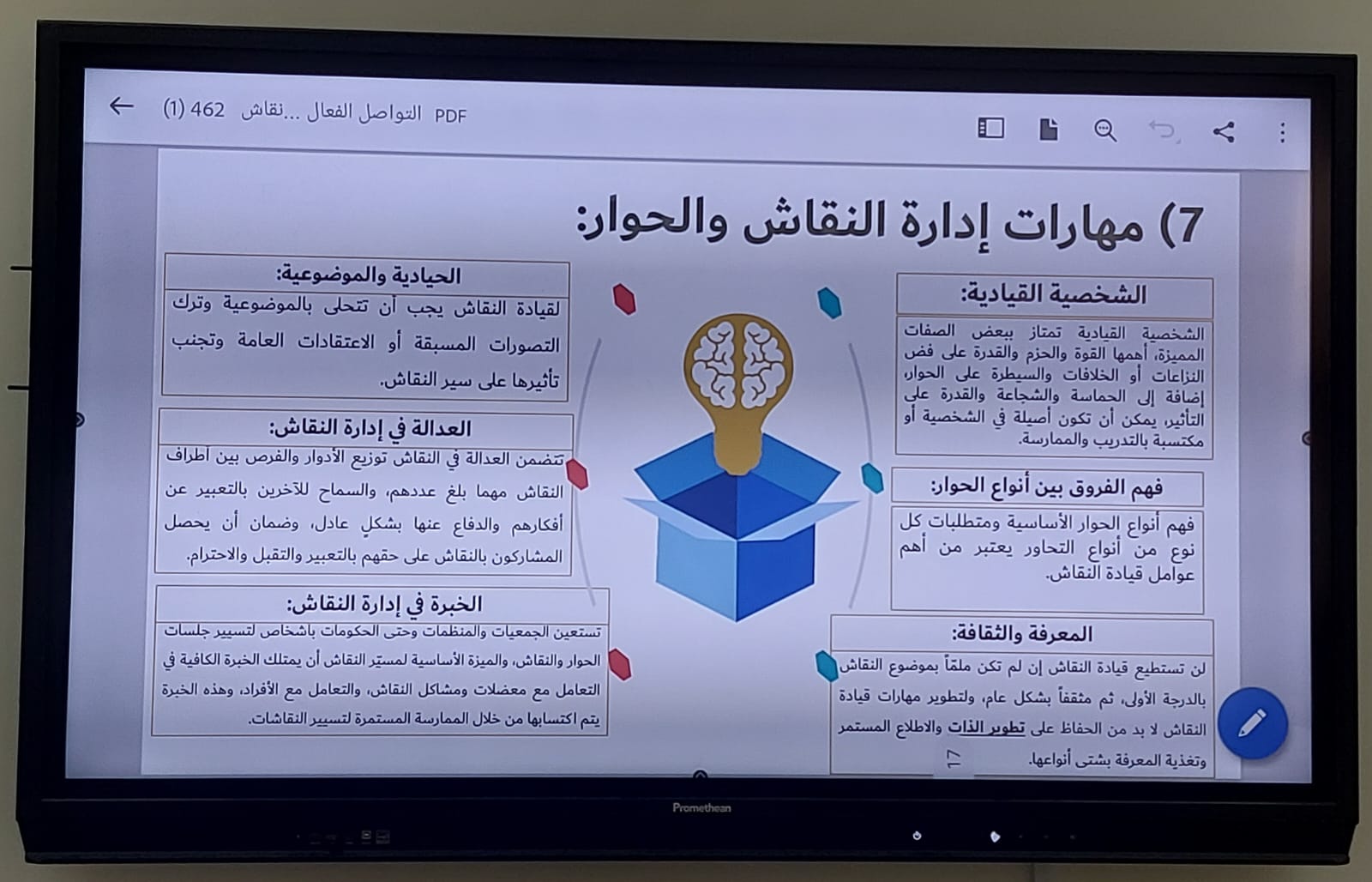 هدفت الورشة إلى تنمية مهارات الطالبات في مجالات التواصل الفعّال وإدارة النقاشات، وتناولت المحاور التالية: