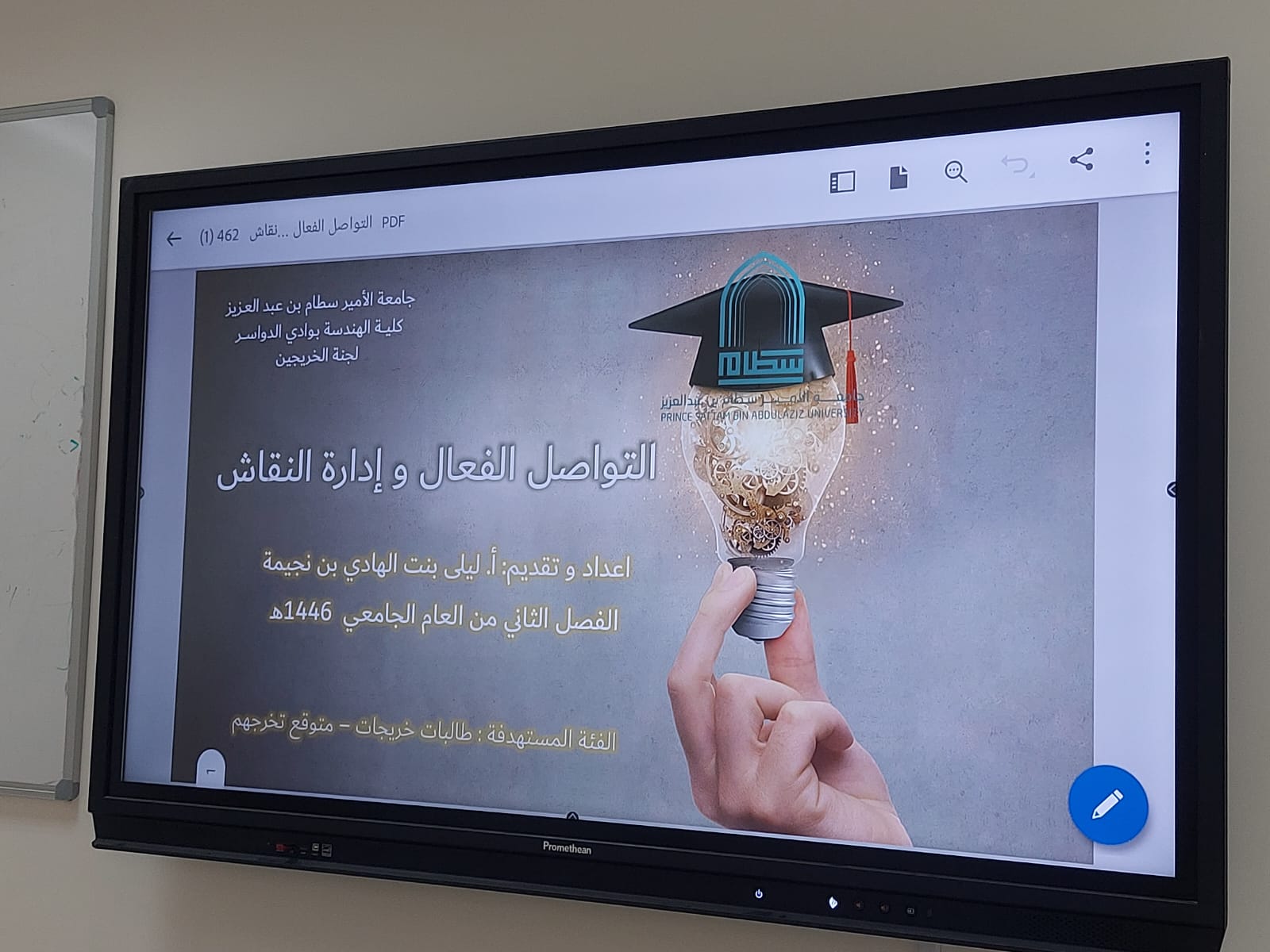 في إطار جهود كلية الهندسة بجامعة الأمير سطام بن عبدالعزيز لدعم الطالبات الخريجات وتعزيز مهاراتهن الشخصية والمهنية، نظّمت لجنة الخريجات بشطر الطالبات، وبالتنسيق مع قسم هندسة الحاسب والمعلومات بكلية الهندسة بوادي الدواسر، ورشة عمل تدريبية بعنوان: