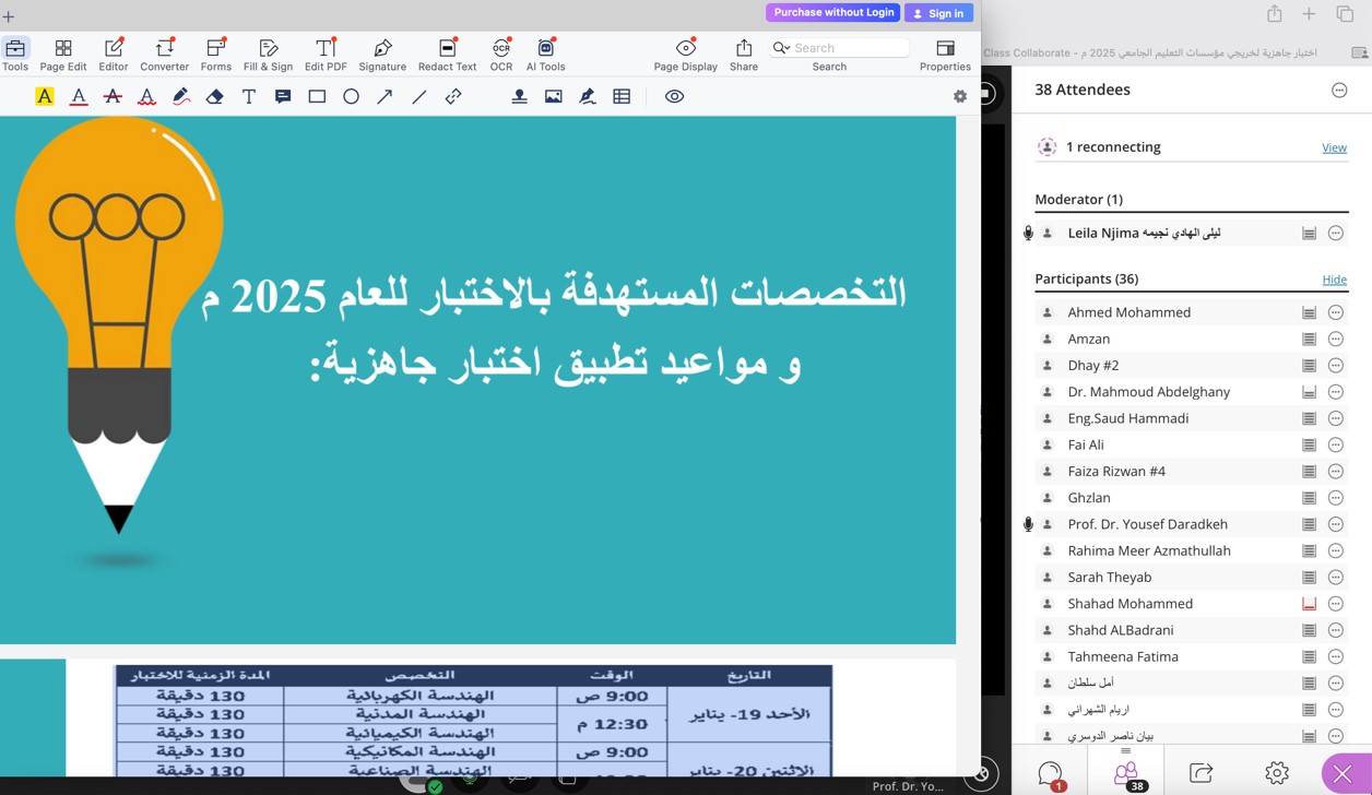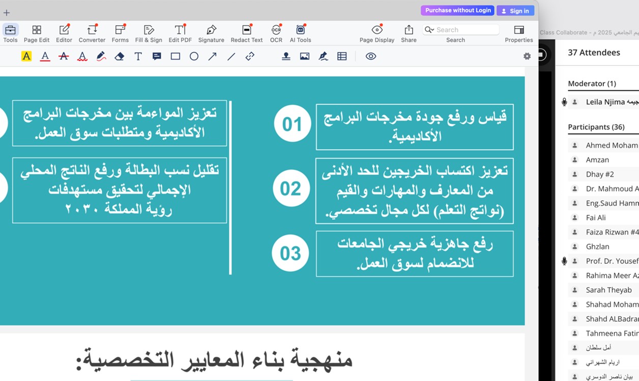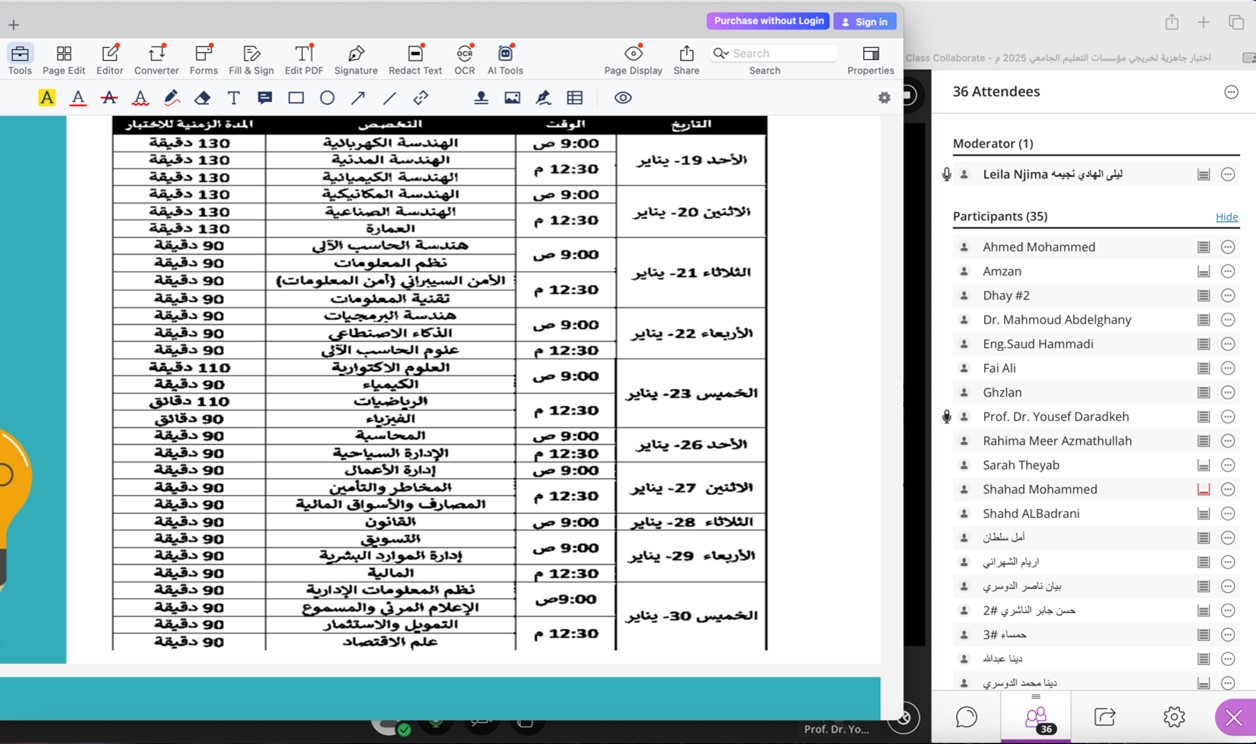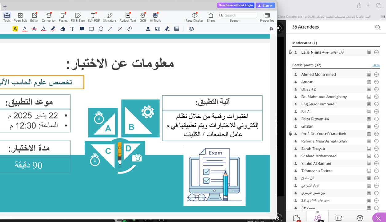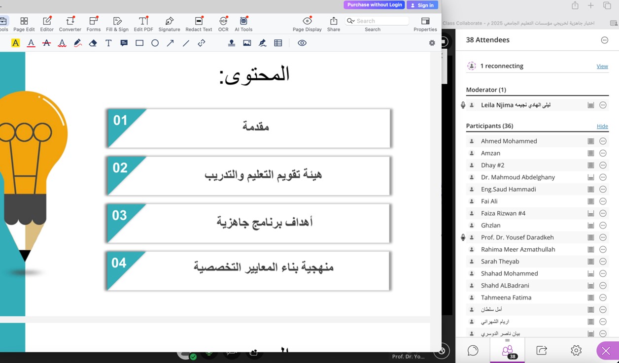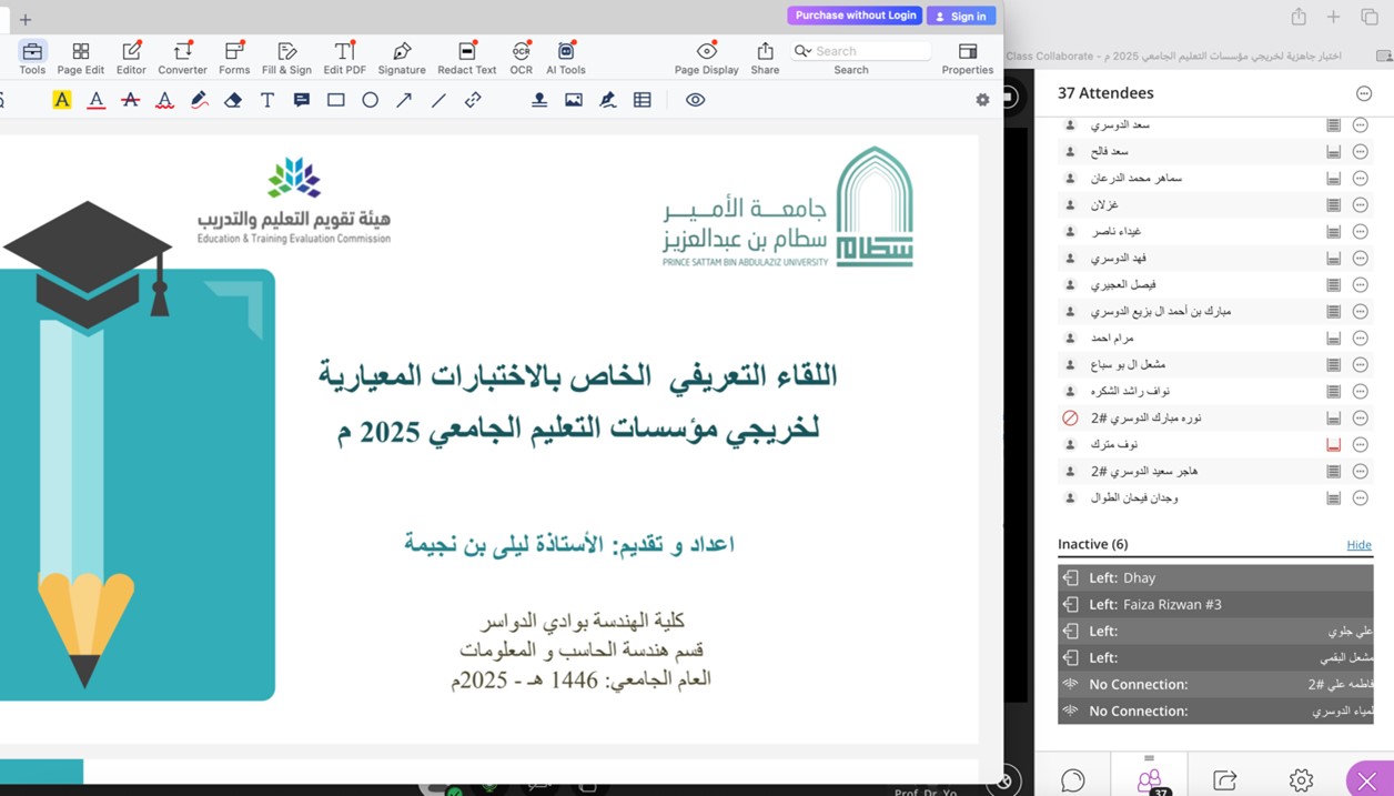 خلال اللقاء قامت أ. ليلى بتقديم شرح شامل للاختبارات المعيارية وشاركت الطالبات خبراتها السابقة في تنسيق هذا الاختبار والآلية المتبعة والموجه بها من هيئة تقويم التعليم والتدريب وعمادة الخدمات التعليمية بالجامعة. كما شارك في الحضور الدكتور يوسف درادكه الذي بدوره قام بشرح آلية اختبار جاهزية وأكد على أهمية اجتياز الاختبار على الصعيدين المهني والأكاديمي لخريجين 2025 م وأيضا ضرورة الإلتزام بالحضور المبكر وتعليمات الإختبار الموضحة. تكما حضر اللقاء عدد من اعضاء هيئة التدريس بقسم الهندسة الكهربائية.