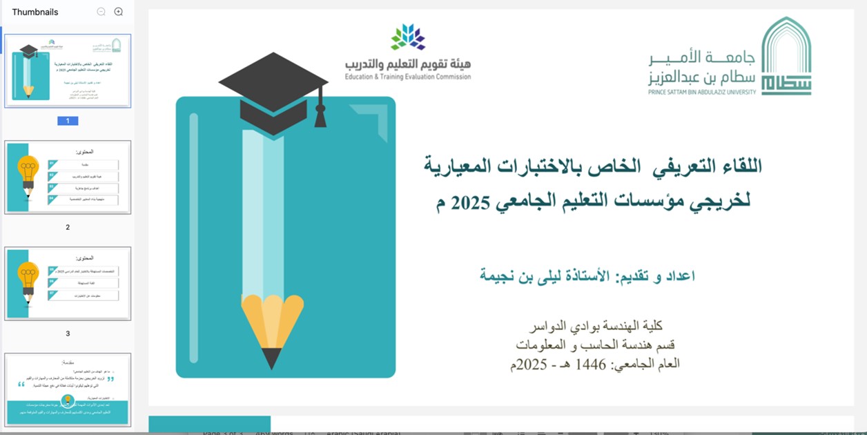 عقد قسم هندسة الحاسب والمعلومات بكلية الهندسة بوادي الدواسر شطر الطالبات بالتعاون مع لجنة الخريجين بالكلية مجال تنمية المهارات المهنية لكل من الطلاب/ الطالبات بكلية الهندسة بوادي الدواسر، يوم الأربعاء 01-01-2025 م الموافق لـ 01-07- 1446 هـ في الساعة السادسة مساء عن طريق نظام البلاكبورد اللقاء التعريفي الخاص بالاختبارات المعيارية لخريجي مؤسسات التعليم الجامعي 2025 م حيث قدمت اللقاء الأستاذة ليلى بن نجيمة وشرحت كافة النقاط المتعلقة باختبار جاهزية وتمحور اللقاء حول المحاور التالية وهي:
