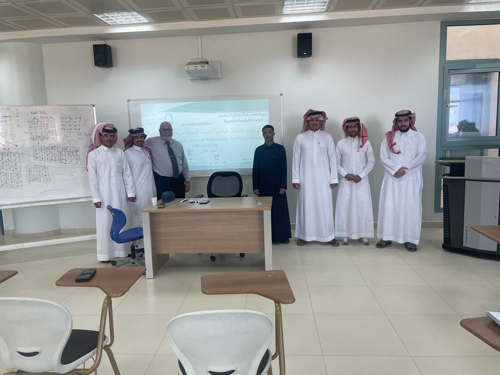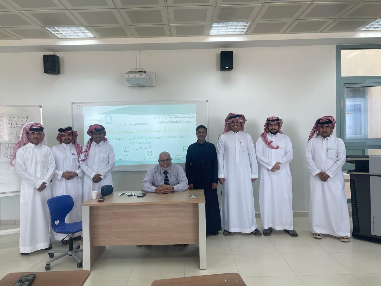 أقامت وحدة الأنشطة الطلابية بكلية الهندسة بوادي الدواسر محاضرة بعنوان "حل بعض المشاكل الهندسية العملية البسيطة من خلال الحل الأمثل "، وقدم الدورة سعادة الدكتور أحمد جلال، الأستاذ المشارك بقسم الهندسة الميكانيكية وذلك يوم الثلاثاء الموافق 24 / 8 / 1445هـ - 2024 / 3 / 5 م ، وقد حضر المحاضرة تسعة طلاب.