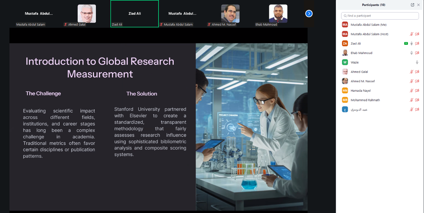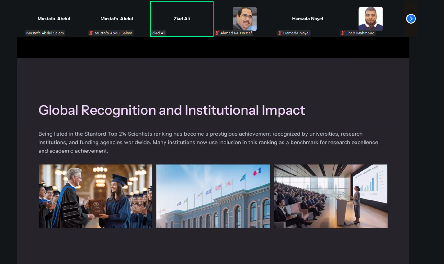 استعرض الدكتور الحلواني خلال المحاضرة تصنيف ستانفورد لأفضل 2% من علماء العالم، وتناول عدة محاور أبرزها التحديات المرتبطة بتصنيف الباحثين حول العالم في مؤشر واحد، مع ضمان شفافية المعايير المستخدمة لقياس أداء هذا العدد الضخم من الباحثين، الذي يتجاوز 100 ألف باحث، ونشر علمي يفوق 25 ألف مجلة دولية، إلى جانب أكثر من 147 تخصصًا فرعيًا.