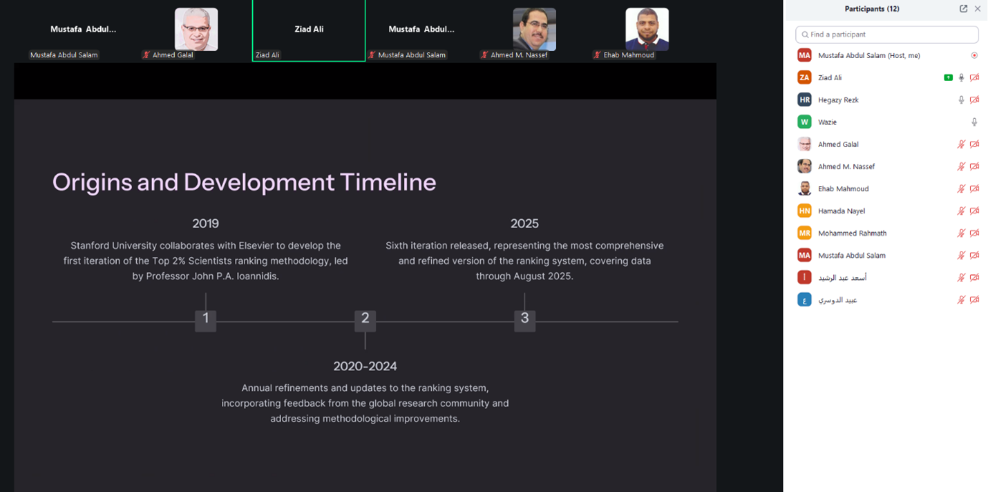 في إطار أنشطة لجنة البحث العلمي بكلية الهندسة بوادى الدواسر، قدّم سعادة الدكتور زياد الحلواني يوم الأحد الموافق 30 نوفمبر 2025 محاضرة وجلسة حوارية عن بُعد عبر منصة "زووم"، جاءت بعنوان "رحلة إلى قائمة النخبة".
