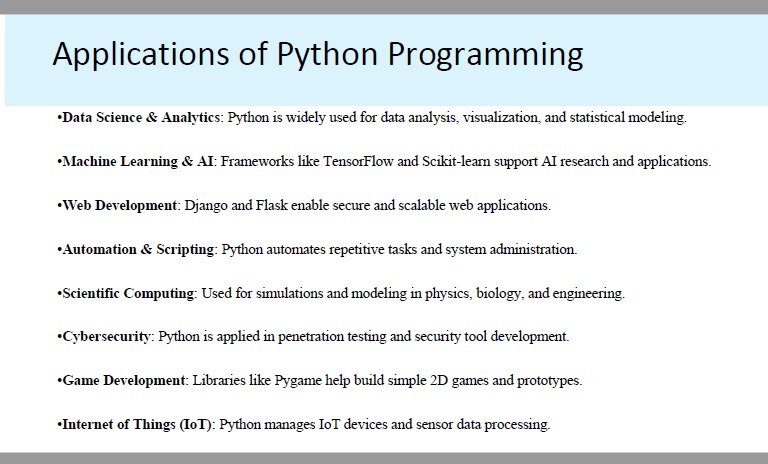 هدفت الورشة إلى تزويد الطالبات بأساسيات لغة البرمجة بايثون والتطبيقات العملية المرتبطة بها، حيث شملت: التعريف بلغة بايثون كلغة عالية المستوى ومتعددة الأغراض، إعداد وتثبيت بيئة بايثون، التعرف على أنواع البيانات وهياكلها، تدفق التحكم، الدوال، تنظيم الأكواد، ومعالجة الملفات، إضافةً إلى فهم الحزم وبنيتها.