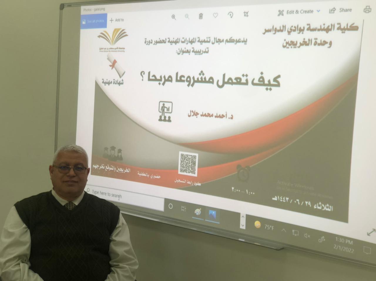 قامت لجنة الخريجين ممثلة بمجال تنمية المهارات المهنية بكلية الهندسة بوادي الدواسر بعقد دورة ُ بعنوان كيف تعمل مشروعا ناجحا ؟ وذلك يوم الثلاثاء بتاريخ 1 /2 /2022 في القاعة 207 حضوريا بالكلية.