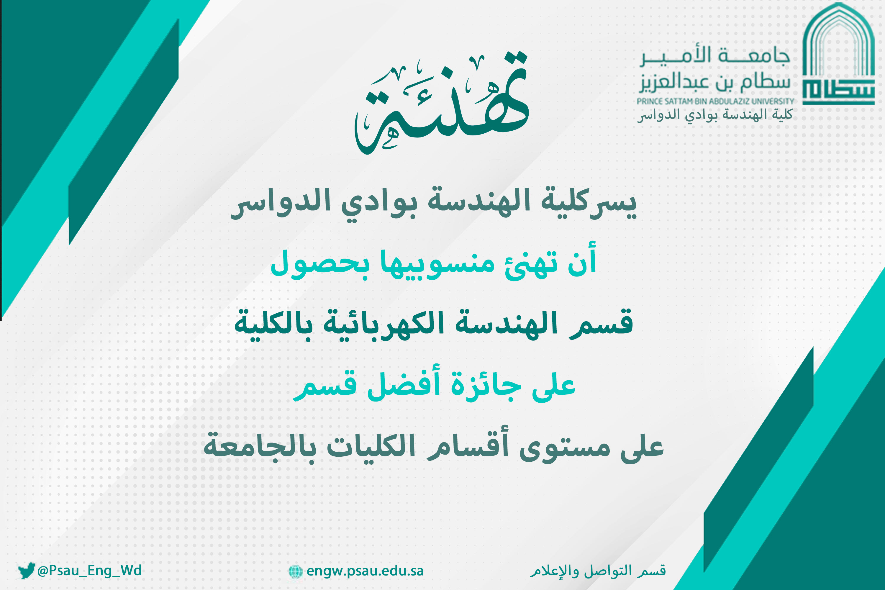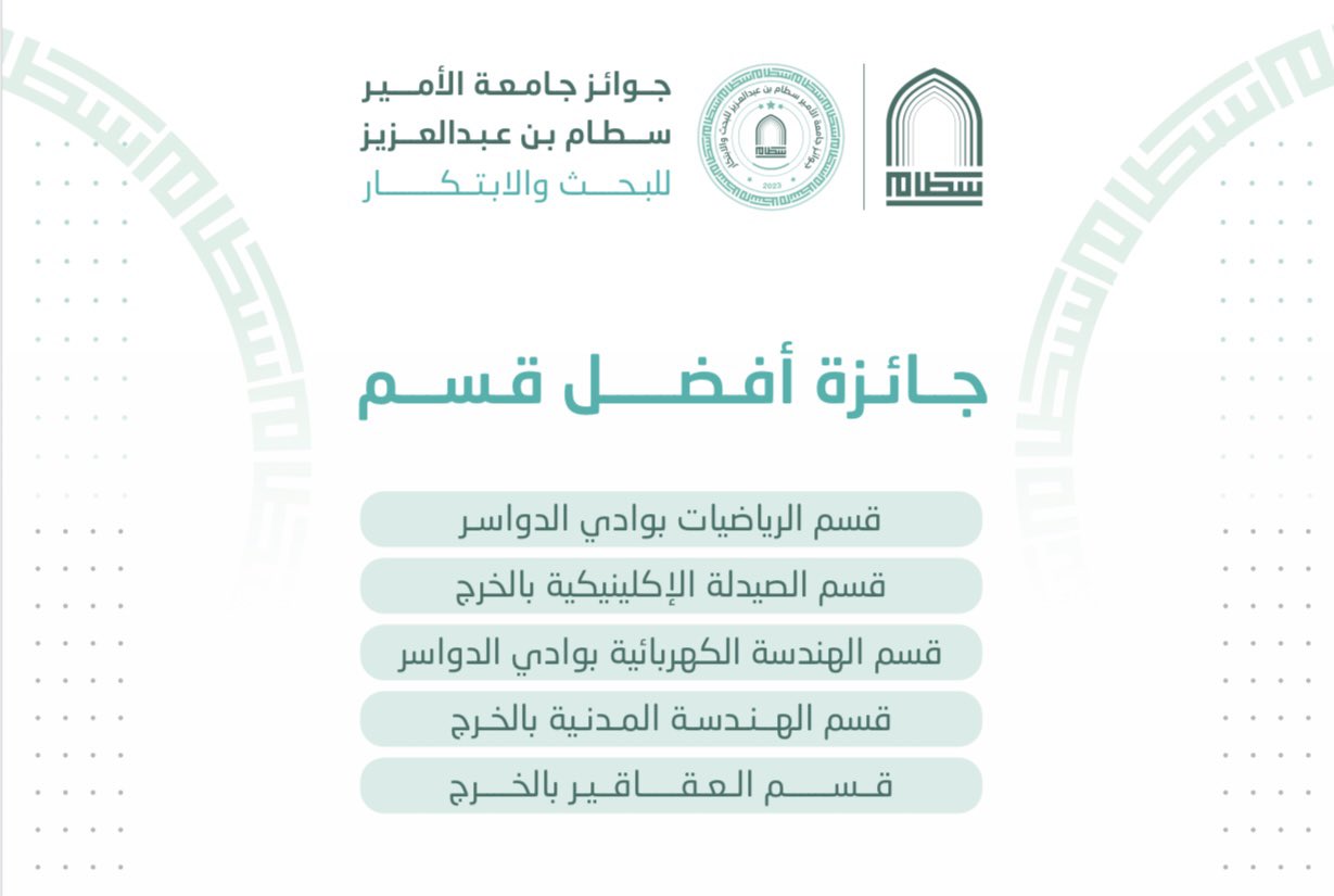 حصل قسم الهندسة الكهربائية بكلية الهندسة بوادي الدواسر على جائزة أفضل قسم على مستوى كليات الجامعة، حيث تم تكريم القسم خلال مؤتمر البحث والتطوير والابتكار والذي أقيم بمسرح  جامعة الأمير سطام بن عبدالعزيز يوم الثلاثاء 19/10/1444هـ.