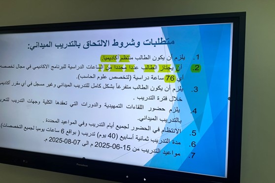 ويأتي هذا اللقاء في إطار حرص الكلية على تعزيز التواصل مع الطالبات وتزويدهن بالإرشادات اللازمة للاستفادة القصوى من فرص التدريب التعاوني والميداني، بما يواكب متطلبات سوق العمل في مجال علوم الحاسب.
