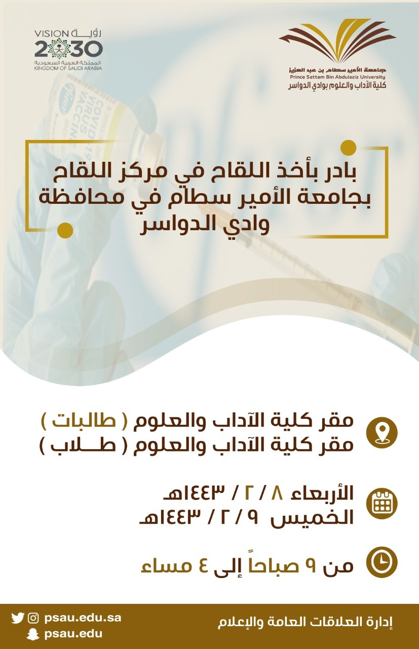 بجهود مباركة من جامعة الأمير سطام بن عبدالعزيز ممثلة بالمستشفى الجامعي تم توفير لقاح كورونا (فايزر) في كلية الآداب والعلوم للطلاب والطالبات وأعضاء هيئة التدريس والموظفين في محافظتي وادي الدواسر و السليل لحجز المواعيد على الرابط التالي : https://covid19vaccine.psau.edu.sa