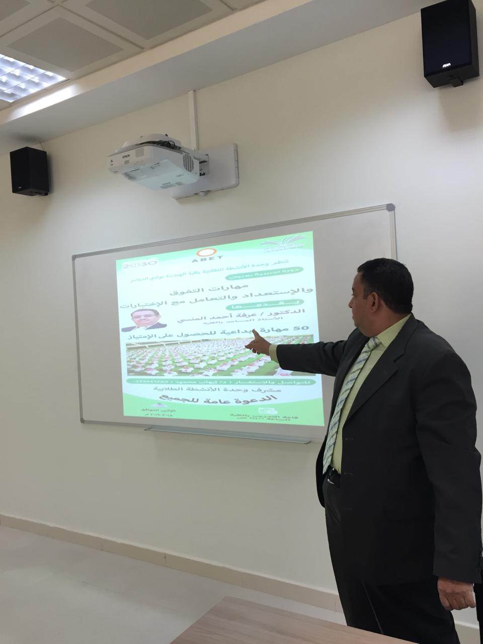 عدسة و تحرير: موفي الهذاب من منطلق حرص كلية الهندسة الدائم وفي إطار الجهود الرامية لتهيئة أبناءها الطلاب للاختبارات النهائية نظمت وحدة الأنشطة الطلابية بالتعاون مع الدكتور / عرفه المنسي ، أستاذ المناهج وطرق التدريس والعلوم المساعد بكلية الهندسة ؛ دورة تدريبية بعنوان : "مهارات التفوق والإستعداد والتعامل مع الإختبارات"وذلك في يوم : الأثنين الموافق : ١٨/ مارس ٢٠١٩م في قاعة التدريب بكلية الهندسة .واشتملت .. هذه الدورة على : (٥٠) مهارة إبداعية للحصول على الأمتياز ...واستهل الدكتور / عرفه ، حديثة مبرزاً أهمية هذه الدورة في تحقيق تفوق الطلاب ؛ لا سيما على المستويين: (الأكاديمي، والخارجي) المحيط بالطالب في بيئته الخاصة والعامة .ثم : أشاد بجهود الكلية في هذا الجانب وأكد للطلاب بأن كلية الهندسة لن تصل لما ترنو إليه إلا من خلالكم لذلك يجب أن تصحب هذه الجهود إرادة وعزيمة من قبلكم تمكننا في بناء عقليات عبقرية قادرة في خوض التحديات نتباها بها في المحافل الدولية بإذن الله .ثم : أستعرض مهارات التفوق والإستعداد للاختبارات في مراحلها المختلفة(قبل و أثناء و بعد) الاختبار، وكيفية تطبيقها في الدراسة الجامعية .وذكر : أنها تهدف لتهيئة الطلاب للاختبارات النهائية نفسياً وعقلياً حتى يؤدوا الاختبارات دون قلق وخوف وبالتالي يكون استيعابهم أكثر وإنجازهم أكبر .وكما ذكر أيضا : أنها تهدف لتوعية الطلاب ببعض الأساليب التي تزيد من أدائهم الصحيح في الاختبارات .وفي نهاية الدورة : تم النقاش والإجابة على استفسارات الطلاب المشاركين في هذه الدورةواختتم : بتقديم النصح وتوعية الطلاب بخطورة بعض السلوكيات الخاطئة التي تتزامن غالبا مع الاختباراتوأكد : على أهمية أن لا يقتصر نجاح الطالب على كلمة تكتب على ورقة الشهادة ، وإنما عليه أن ينمي معارفه، ومهاراته، ومعلوماته لتصبح جزءا أصيلا في ذاته المستقبلية.وعلى هامش هذه الدورة أوضح : وكيل الكلية للشؤون التعليمية والأكاديمية سعادة الدكتور / عبدالله الهجاج ، أن كلية الهندسة تحرص دائماً على تقديم كل ماهو جديد ومفيد من خلال الأنشطة المخطط لها لتطوير مهارات الطلاب علمياً مثل الدورات والمحاضرات وورش العمل في مختلف المجالات ومنهجية تنفيذها في إطار منظومة الجودة لضمان مواكبة معايير التعليم والتدريب العالمية التي يمكن البرهنة على أنها توفر الثقة بأن المنتج المقدمة للطلاب أو الخدمة كفيلة بإنتاج شخصيات قادرة على الإبداع، والابتكار للوصول إلى تحقيق نتائج ذات تأثير إيجابي على المجتمع المحلي، والذي قد يمتد إلى أن يؤثر في كافة أنحاء العالم.ثم دعى سعادته الأساتذة والمحاضرين بحث أبنائهم الطلاب لحضور هذه البرامج لإستفادة أكبر عدد ممكن من طلاب كلية الهندسة .