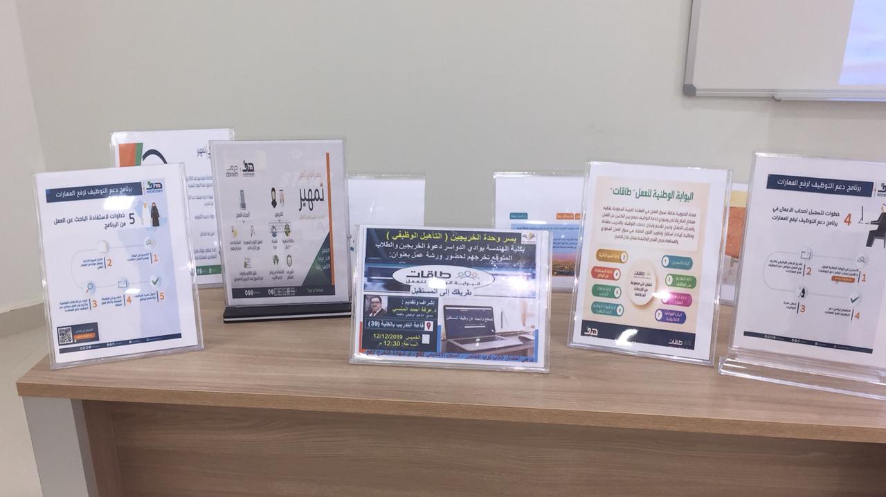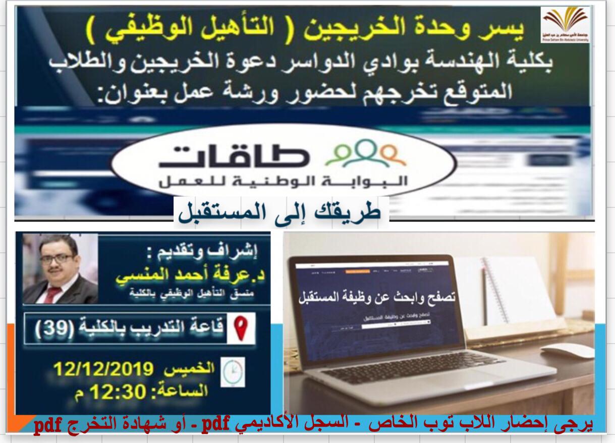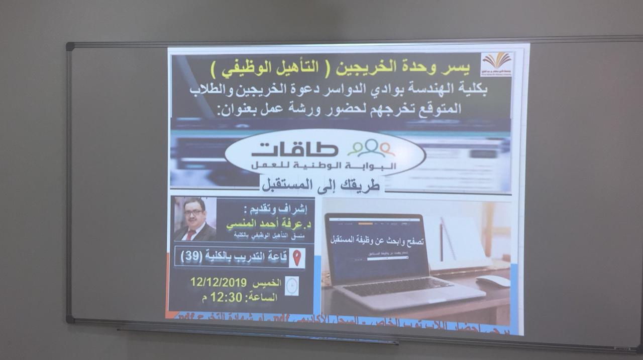 عدسة و تحرير: موفي الهذابأتباعاً لحرص جامعة الأمير سطام بن عبدالعزيز, وتفعيلاً لدور وحدة الخريجين في تسخير جميع الإمكانات والبرامج لخدمة الطالب الخريج ، في تطوير ذاته وصقل مهاراته , من خلال البرامج العلمية والفعاليات الثقافية ..؛ ومن هذا المنطلق وجه سعادة عميد كلية الهندسة المكلف الدكتور / محمد الحيدر , سعادة الدكتور ابي يونس طه , المشرف على وحدة الخريجين في عقد لقاء تعريفي عن البوابة الوطنية للعمل طاقات للطلاب المتوقع تخرجهم للعام الجامعي 1441هـ سواء من الفصل الدراسي الأول أو الثاني ، لتثقيفهم وليكونوا على دراية بالتطبيقات الحكومية وملمين بإجراءاتها الإلكترونية الصحيحة .وبناء على ذلك عقدت ورشة عمل تعريفية بعنوان : طاقات البوابة الوطنية للعمل (طريقك إلى المستقبل ) من إعداد وتقديم سعادة الدكتور / عرفه أحمد المنسي , منسق التأهيل الوظيفي بالكلية وذلك في يوم الخميس الموافق : 12 / ديسمبر 2019م في قاعة التدريب .وهدفت هذه الورشة إلى : تعريف الطالب الخريج ، على كيفية الوصول إلى البوابة الوطنية طاقات وتعريفة بالشروط وطريقة التسجيل . وتمحورت نقاشات هذه الورشة حول أربع محاور هي :المحـــــور الأول : التعريف بالبوابة الوطنية للعمل " طاقات" .المحــــور الثاني : شروط التسجيل فيها كمستخدم جديد .المحــــور الثالث : التعريف ببرنامجي " حافز – تمهير" ، والهدف منهما .المحـــــور الرابع : طريقة التسجيل كمستخدم جديد. وأستهل المنسي حديثة بالتعريف بــــ (البوابة الوطنية للعمل طاقات) والهدف منها حيث قال : هو برنامج يقدم باقة من الخدمات المتخصصة مقدمة من صندوق تنمية الموارد البشرية (بهدف) موجهة لدعم التوظيف للباحثين عن العمل من مواطني المملكة العربية السعودية وتتركز خدمات طاقات على الربط الوظيفي بين الباحثين عن عمل وبين الجهات الموظفة من القطاع الخاص حيث يتم عرض الفرص الوظيفية المتوفرة للباحثين عن العمل من خلال عدة قنوات مثل موقع التوظيف الالكتروني ومراكز التأهيل والتوظيف بالإضافة إلى ذلك تقدم طاقات فرص تدريبية وتأهيلية تتناسب مع احتياجات سوق العمل من خلال مراكز التأهيل والتوظيف ومواقع التدريب .وقام سعادته بتوضيح طريقة الدخول والتسجيل للطلاب أساليب سلسة ، حيث استعان في ذلك ، بنماذج مرئية مختصرة لطريقة الدخول من خلالها للتسجيل كمستخدم جديد أو مستخدم سابق .هذا ، وقد تفاعل الحضور مع المادة التدريبية المقدمة تفاعلًا ملحوظًا ؛ أضفى على اللقاء جوّاً من الحيوية والنشاط والعمل .وتضمنت أعمال الورشة كذلك التعريف ببرنامج حافز البحث عن عمل من حيث مميزاته , وشروطه , والتزاماته . وفي ختام الورشة تم تدوين بيانات الطلاب الخريجين الذين تم قبول تسجيلهم على البوابة ، ليتم إلحاقهم على بوابة الخريجين بالجامعة ، وإجراء استبيان حول الورشة وما مدى استفادة الطلاب منها ، حرصاً لتحقيق للأهداف المرجوة .وقد أعجب الحضور بالمادة التدريبية المقدمة من خلال الورشة ، وأشادوا بها، وبأهميتها في الحصول على الفرصة الوظيفية المناسبة .