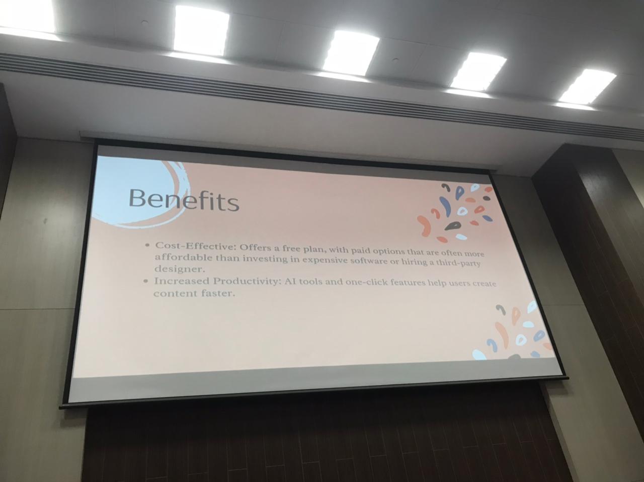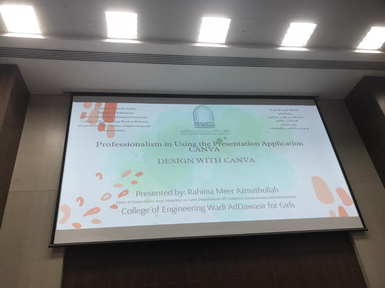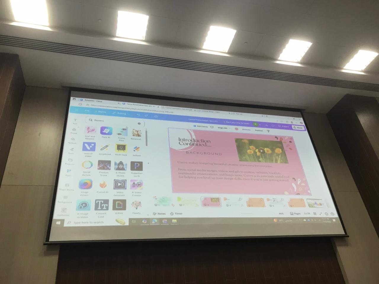 وقد تضمنت الورشة العلمية أيضا نظرة عامة عن تصميم الكانفا، شرح المميزات، عرض الفوائد، ما الذي يمكن تصميمه، خطوات تسجيل الدخول، اختيار تصميم مختلف، وضع عناصر مختلفة من الرسومات، تطبيق العرض تقديمي. وفي نهاية الندوة تم الرد على أسئلة واستفسارات الطالبات وقد لاقت الفعالية ترحيب واستحسان وتفاعل كبير من الطالبات.