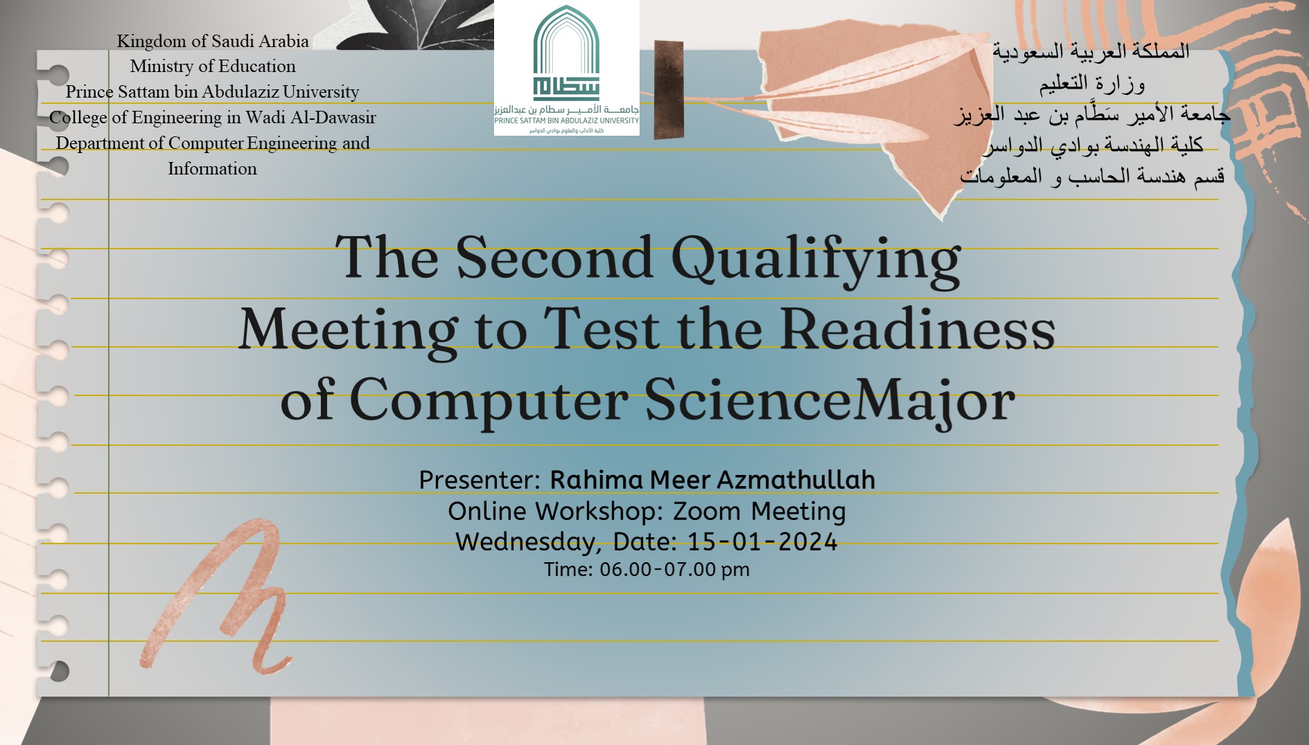 قدمت لجنة الدراسات الخريجين بشطر الطالبات ورشة عمل نيابة عن قسم هندسة الحاسب والمعلومات بكلية الهندسة بوادي الدواسر بعنوان "اللقاء التأهيلي الثاني لاختبار جاهزية تخصص علوم الحاسب الآلي" قدمتها الأستاذة رحيمة مير عظمة الله - المحاضرة في قسم هندسة الحاسب والمعلومات بكلية الهندسة بوادي الدواسر يوم الأربعاء الموافق 15/01/2025 الساعة 6.00 -7.00 مساءً. هدفت الورشة إلى تقديم:
