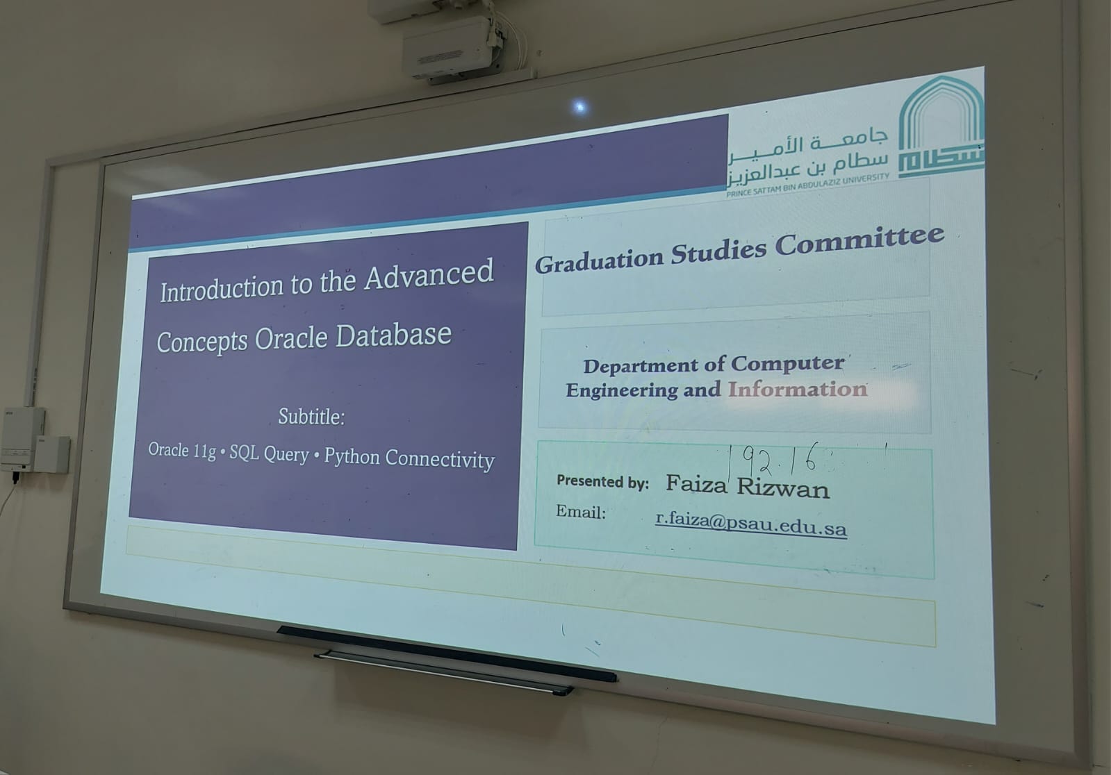 نظّمت وحدة تنمية المهارات المهنية، ورشة عمل بعنوان «المفاهيم المتقدمة في قواعد بيانات Oracle»، وذلك لطالبات قسم هندسة الحاسب والمعلومات بكلية الهندسة بوادي الدواسر. وقدّمت الورشة الأستاذة فايزة رضوان، المحاضرة بالقسم، يوم الخميس الموافق 16/4/2026م، من الساعة 12:00 ظهرًا حتى 1:00 ظهرًا.