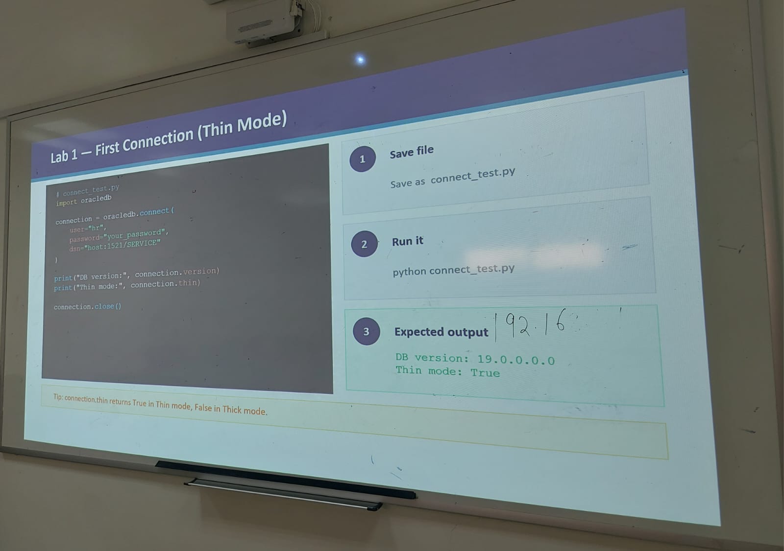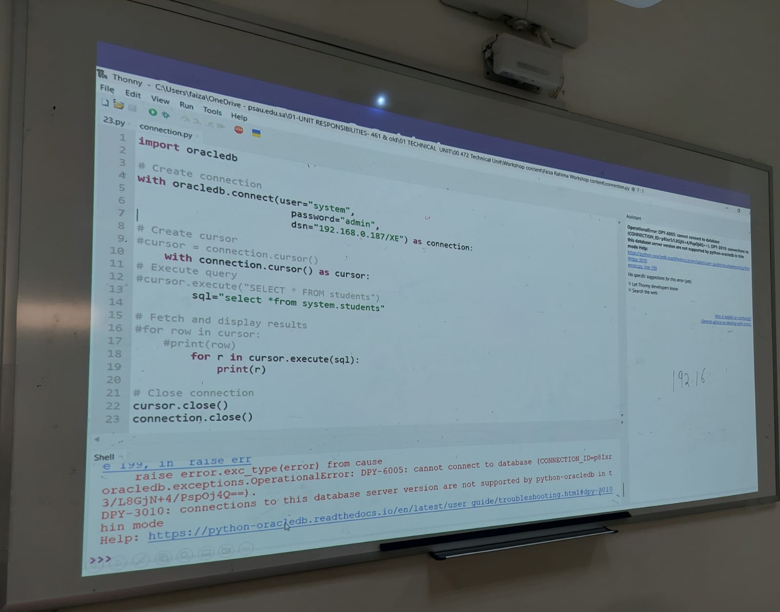 كما تناولت الورشة آلية تثبيت وربط بيئة Python مع OracleDB، والتعامل مع الاستعلامات المختلفة باستخدام بايثون، مع شرح الوظائف (Functions) وبرامج التشغيل (Drivers) المرتبطة بها. إضافةً إلى ذلك، قدّمت الورشة إرشادات عملية للتعامل مع الأخطاء الشائعة وطرق معالجتها بشكل سريع وفعّال.