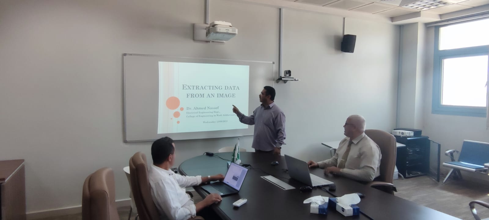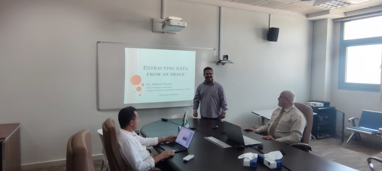 أقامت لجنة البحث العلمي بكلية الهندسة بوادي الدواسر ورشة عمل بعنوان "كيفية استخلاص البيانات من الصور" وقدم الورشة سعادة الدكتور أحمد ناصف، الأستاذ المساعد بقسم الهندسة الكهربية وذلك يوم الأربعاء الموافق ١٣ سبتمبر ٢٠٢٣