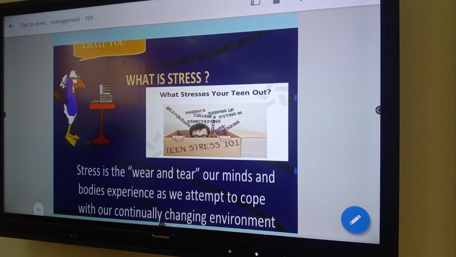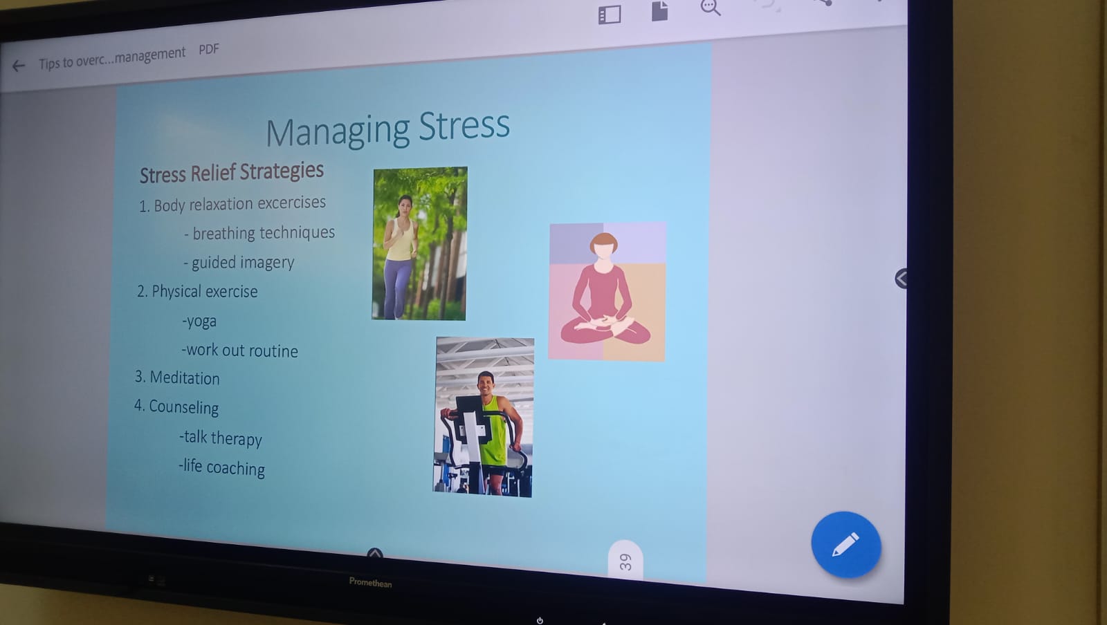 كما تم تقديم نصائح عملية لإدارة التوتر، شملت أهمية النشاط البدني، تمارين التنفس والتأمل، النوم المنتظم، التغذية الصحية، والتفكير الإيجابي. وخصصت الأستاذة وقتًا للرد على استفسارات الطالبات بشكل مباشر، مما أضفى طابعًا تفاعليًا ومفيدًا للجميع.