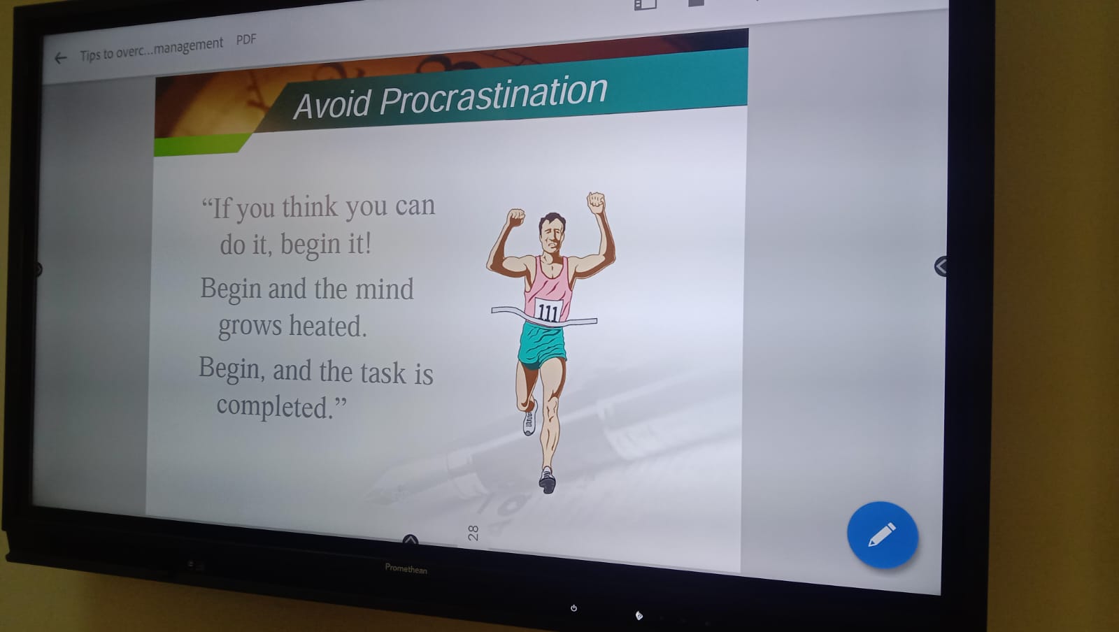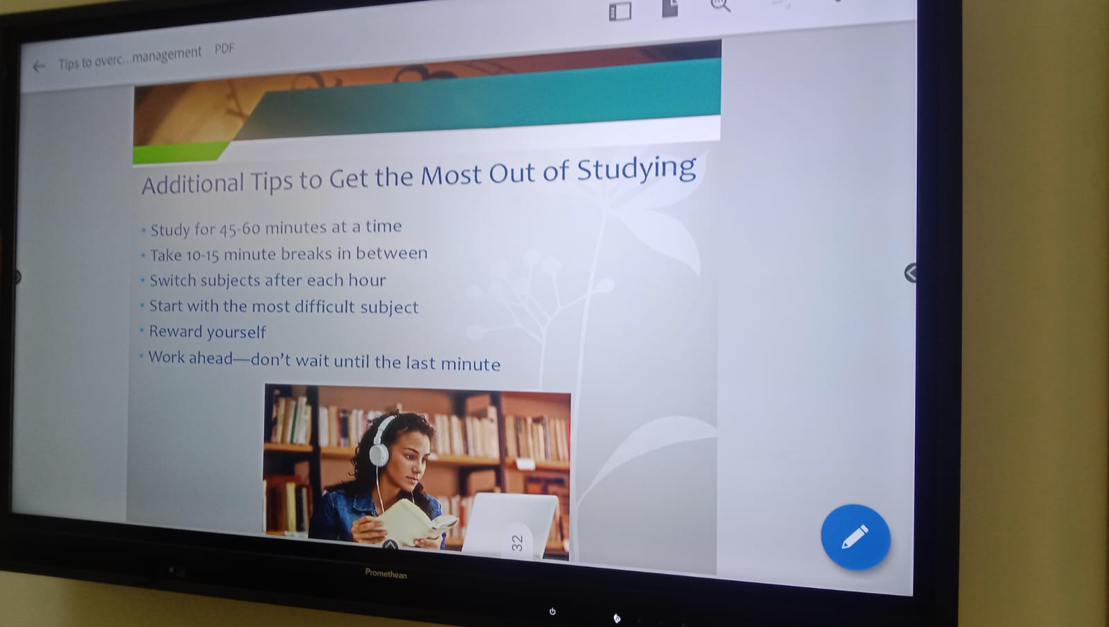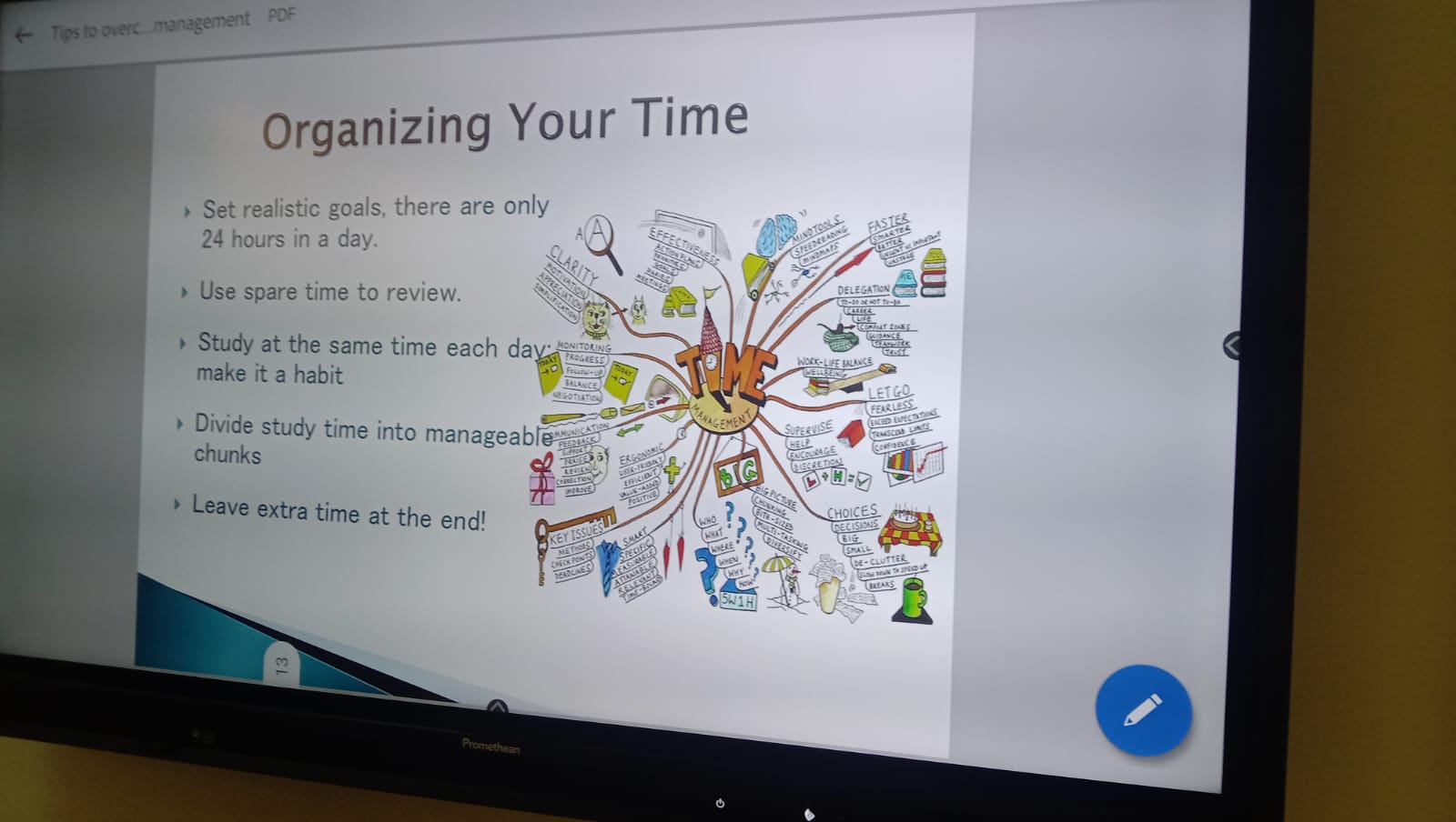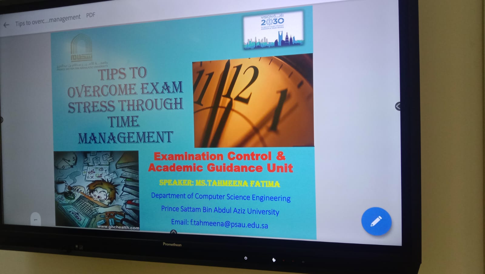 نظّمت وحدة الإرشاد الأكاديمي بشطر الطالبات في كلية الهندسة بوادي الدواسر، بالتعاون مع لجنة الاختبارات، ورشة عمل بعنوان "نصائح للتغلب على توتر الامتحانات من خلال إدارة الوقت"، وذلك يوم الثلاثاء الموافق 29 أبريل 2025، في تمام الساعة 12:00 ظهرًا، بحضور 15 طالبة من مختلف التخصصات.