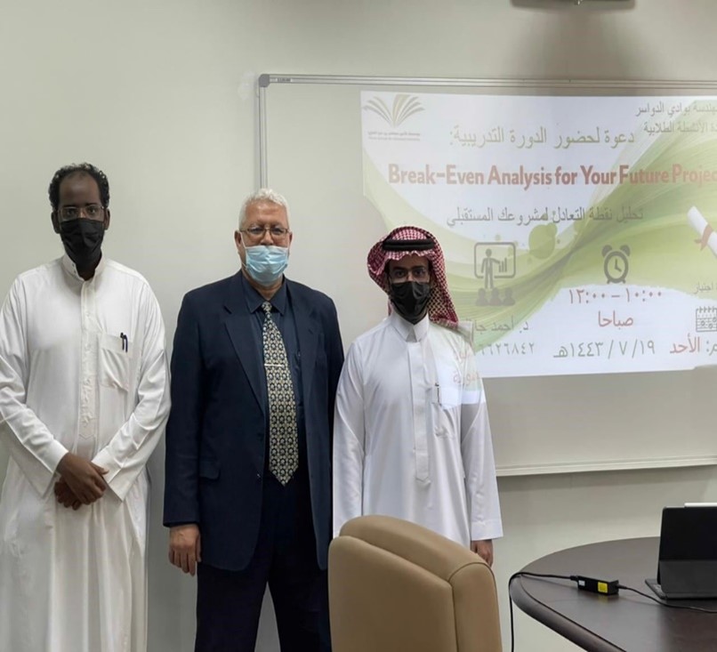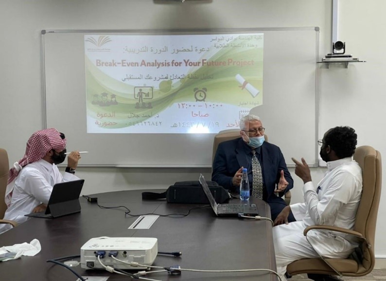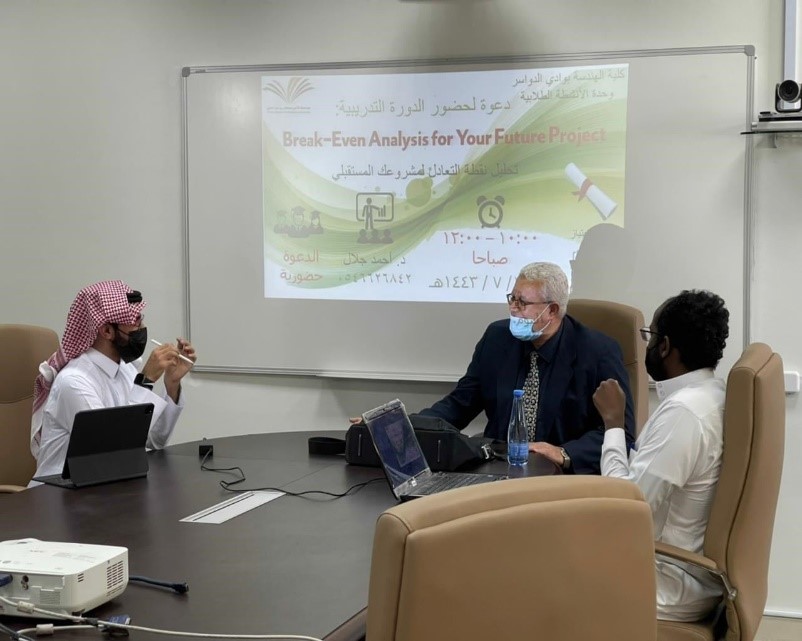 أقيمت ورشة تدريبية في يوم الأحد الموافق 1443/07/19 في كلية الهندسة بجامعة الأمير سطام في وادي الدواسر بعنوان تحليل نقطة التعادل لمشروعك المستقبلي قام بتقديمها الأستاذ المشارك بقسم الهندسة الميكانيكية الدكتور أحمد جلال.