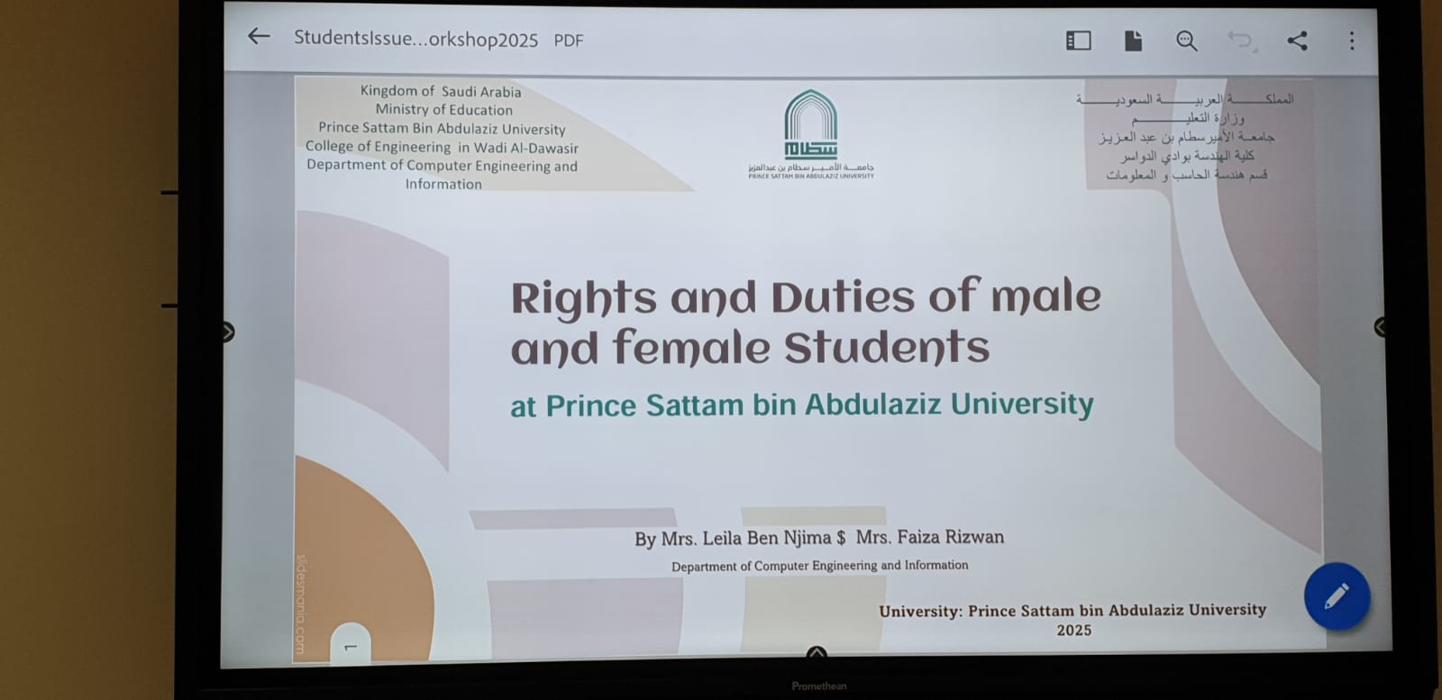 قدمت لجنة مشاكل الطلاب بقسم هندسة الحاسب والمعلومات - كلية الهندسة بوادي الدواسر، ورشة عمل بعنوان "حقوق وواجبات الطلاب والطالبات في جامعة الأمير سطام بن عبد العزيز"، قدمتها الأستاذة ليلى بن نجيمة (منسقة برنامج علوم الحاسب ) والأستاذة فايزة رضوان (محاضرة)، بقسم هندسة الحاسب والمعلومات، كلية الهندسة بوادي الدواسر، يوم الاثنين الموافق 28/04/2025، من الساعة 12:30 ظهرًا إلى 1:30 ظهرًا. هدفت الورشة إلى: