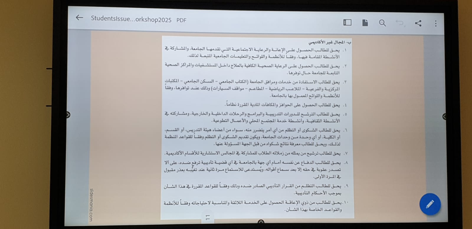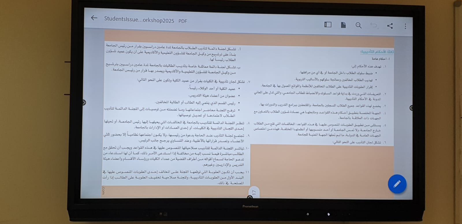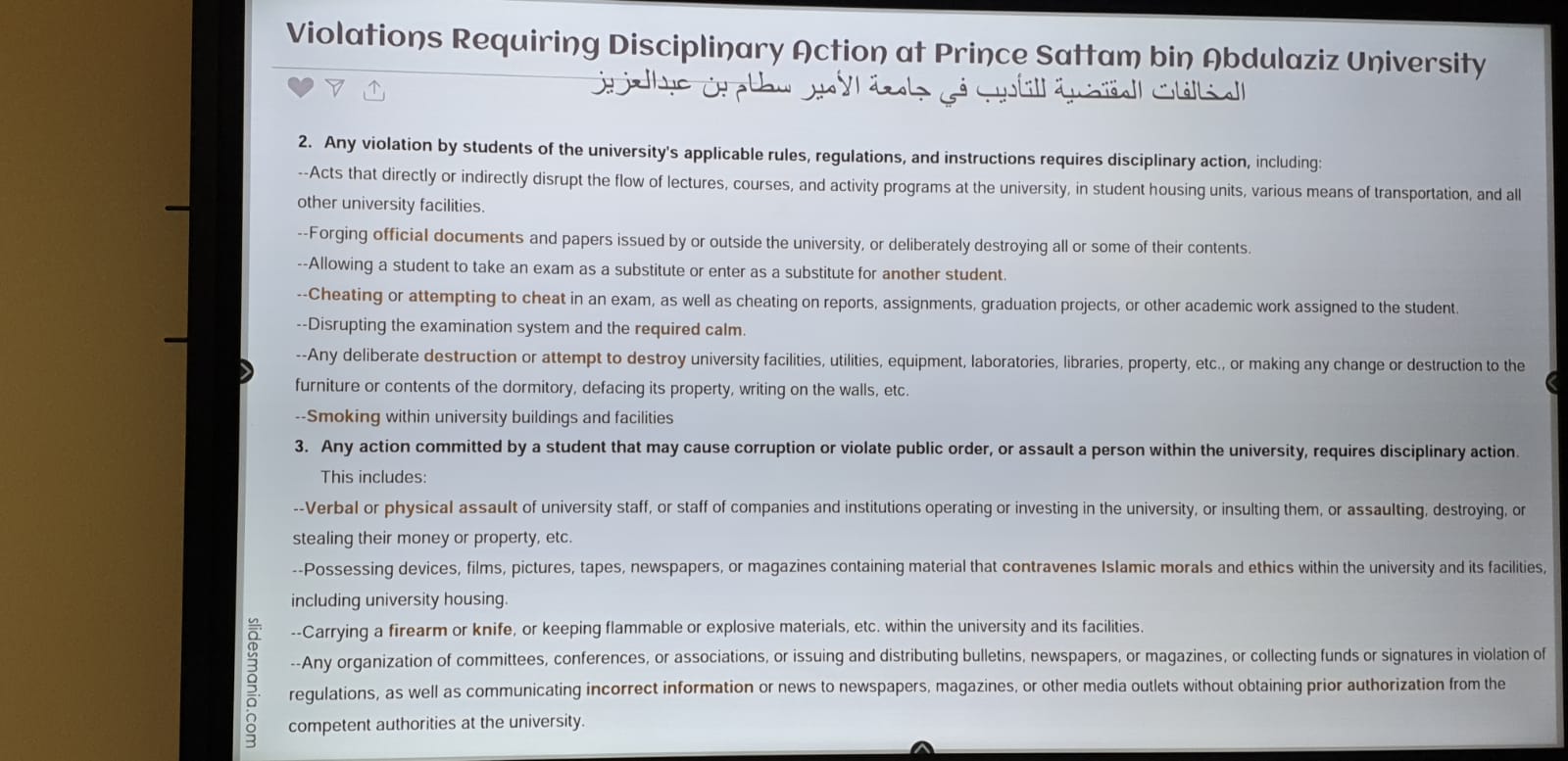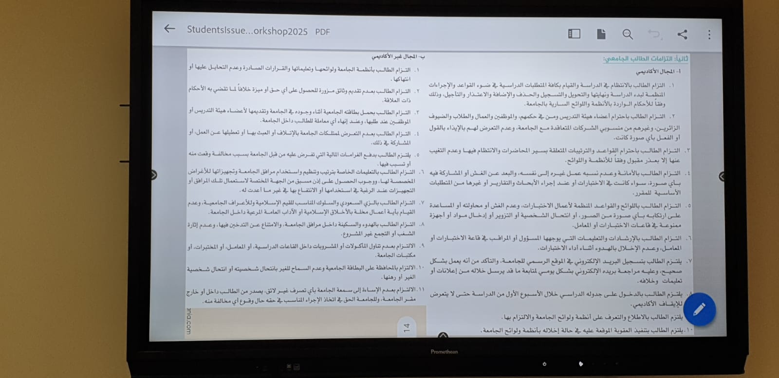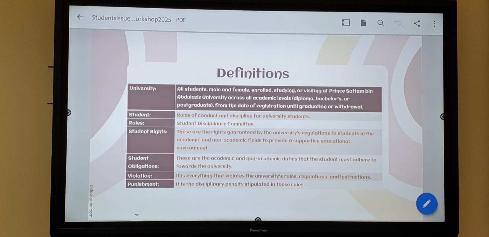 قدّمت الورشة شرحًا وافيًا للوائح والسياسات التأديبية المطبقة على طلاب جامعة الأمير سطام بن عبد العزيز. وتم تعريف المشاركين بمفاهيم رئيسية، بما في ذلك تعريفات "حقوق الطلاب" و"التزاماتهم" و"المخالفات" و"العقوبات"، كما حددتها الجامعة. وأكدت الجلسة على أهمية الالتزام بالمسؤوليات الأكاديمية وغير الأكاديمية، مع تسليط الضوء على الحقوق المكفولة للطلاب لضمان بيئة تعليمية داعمة. وتم شرح دور لجنة التأديب الطلابي بوضوح، بالإضافة إلى الصلاحيات المخولة لمجلس الجامعة لتفسير اللوائح. وقد ساهمت هذه الورشة في تعزيز وعي الطلاب بواجباتهم وحقوقهم، وإعدادهم للمساهمة الإيجابية في مجتمع الجامعة من خلال السلوك المسؤول والالتزام بالمعايير المؤسسية.