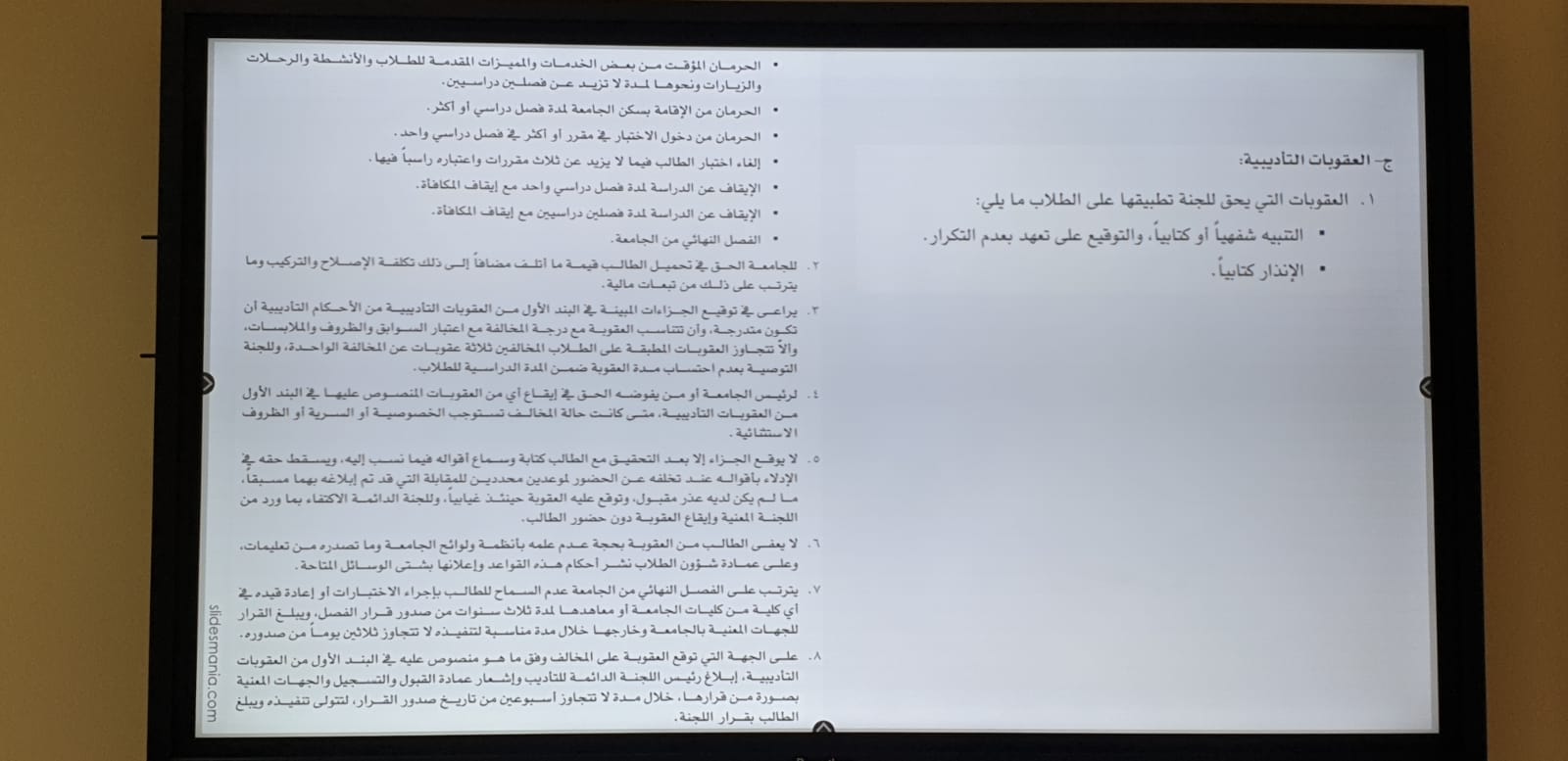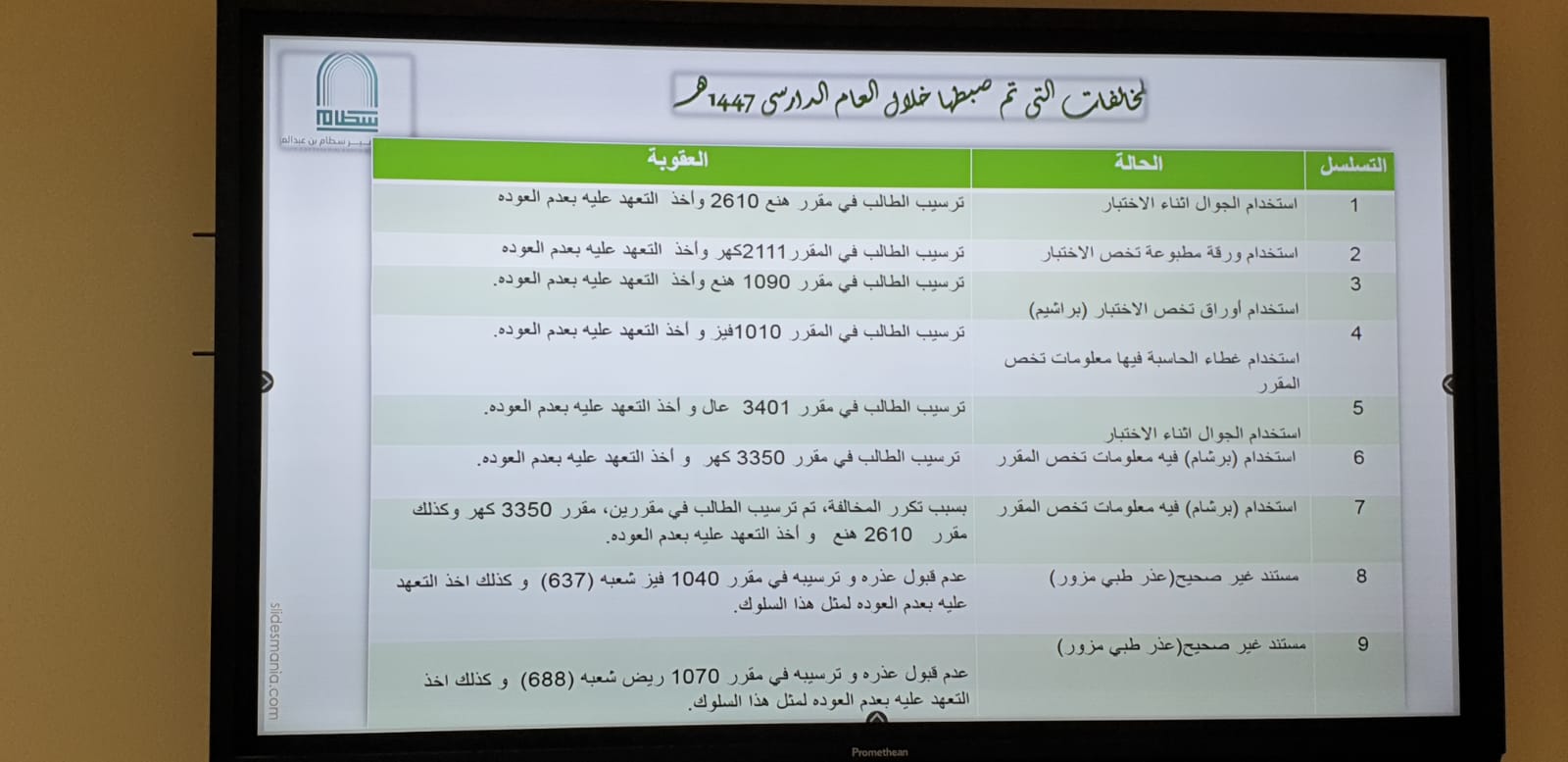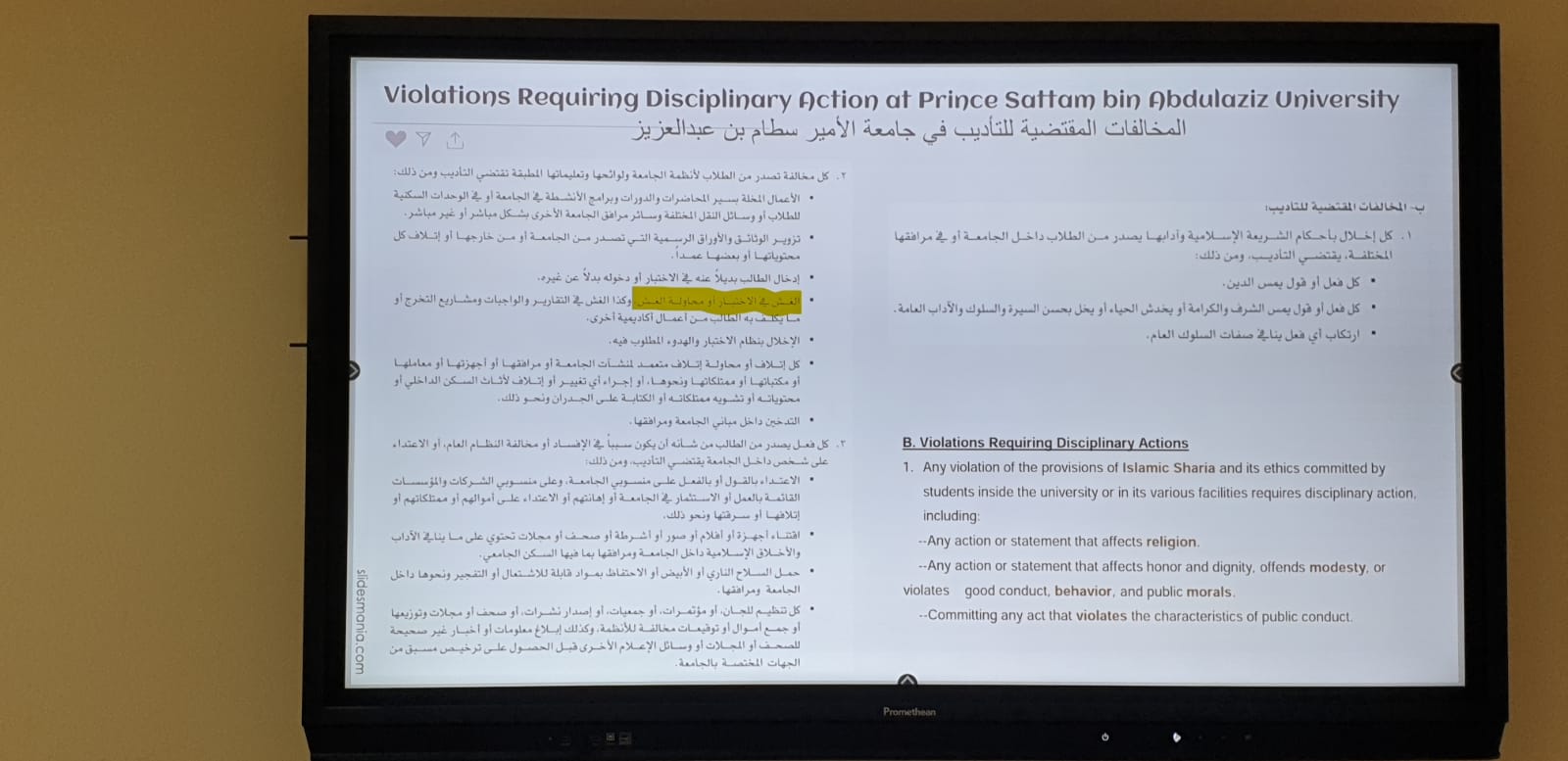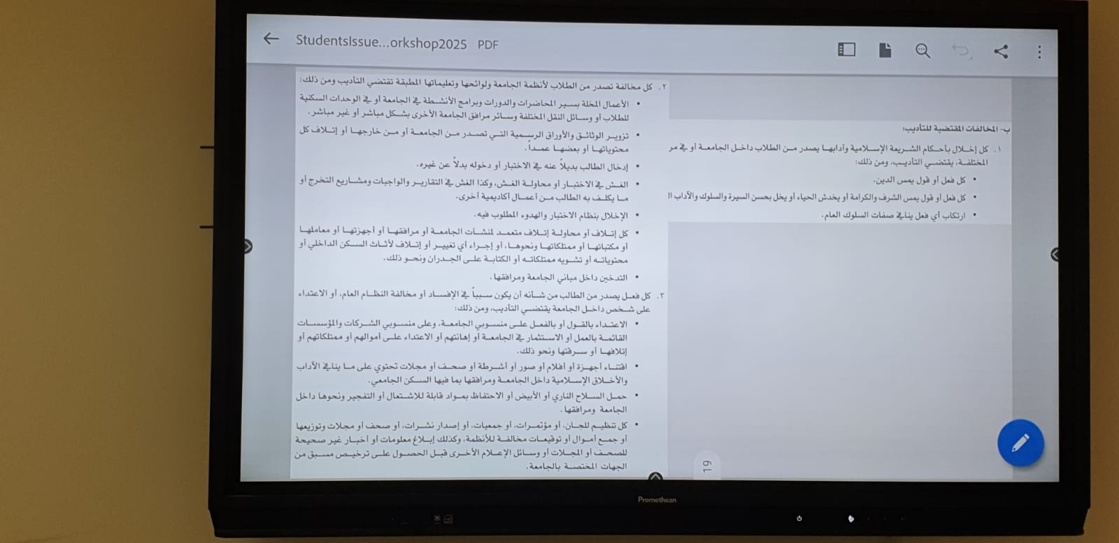 قدّمت الورشة شرحًا وافيًا للوائح والسياسات التأديبية المطبقة على طلاب جامعة الأمير سطام بن عبد العزيز. وتم تعريف المشاركين بمفاهيم رئيسية، بما في ذلك تعريفات "حقوق الطلاب" و"التزاماتهم" و"المخالفات" و"العقوبات"، كما حددتها الجامعة. وأكدت الجلسة على أهمية الالتزام بالمسؤوليات الأكاديمية وغير الأكاديمية، مع تسليط الضوء على الحقوق المكفولة للطلاب لضمان بيئة تعليمية داعمة. وتم شرح دور لجنة التأديب الطلابي بوضوح، بالإضافة إلى الصلاحيات المخولة لمجلس الجامعة لتفسير اللوائح. وقد ساهمت هذه الورشة في تعزيز وعي الطلاب بواجباتهم وحقوقهم، وإعدادهم للمساهمة الإيجابية في مجتمع الجامعة من خلال السلوك المسؤول والالتزام بالمعايير المؤسسية.