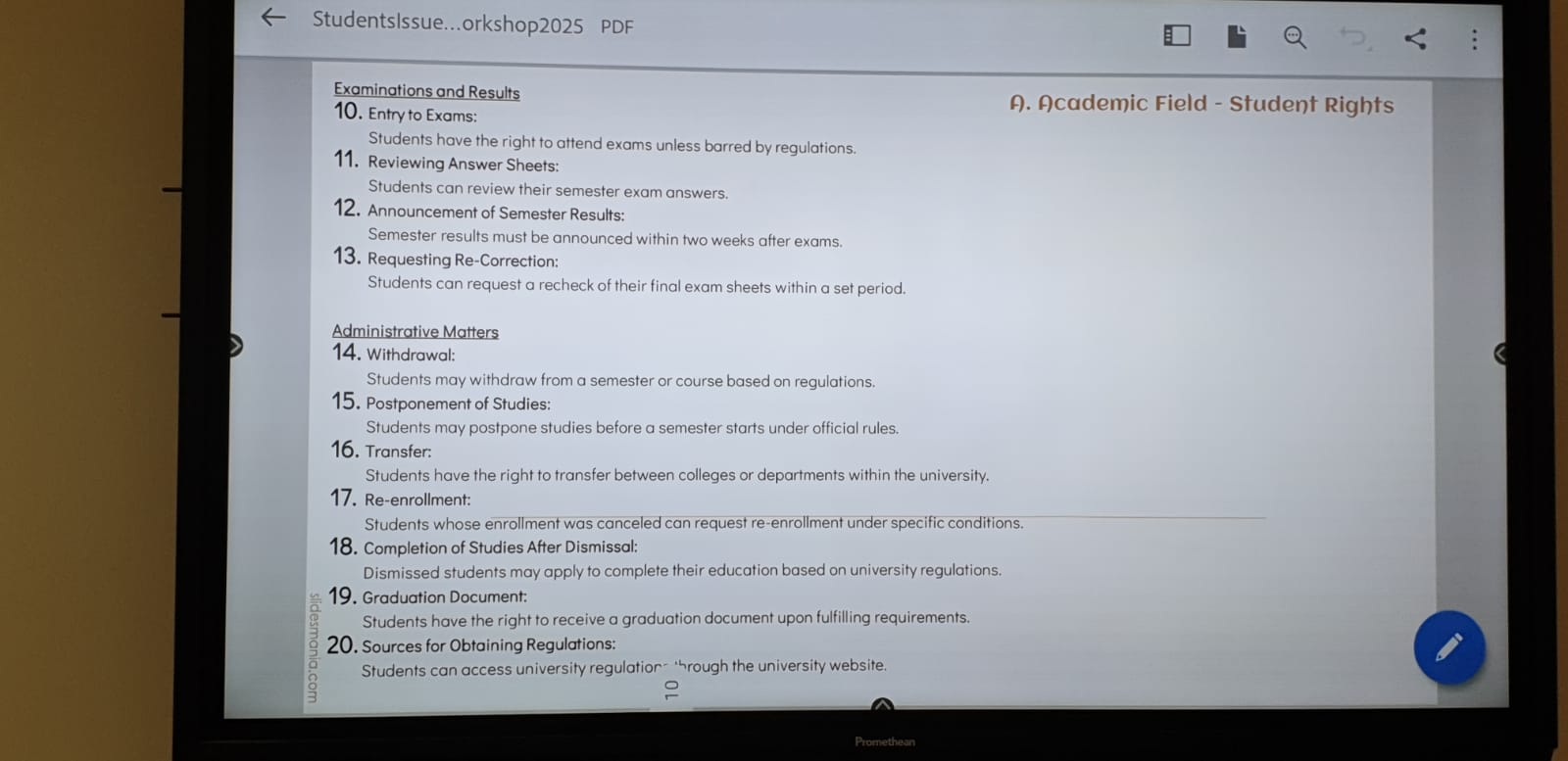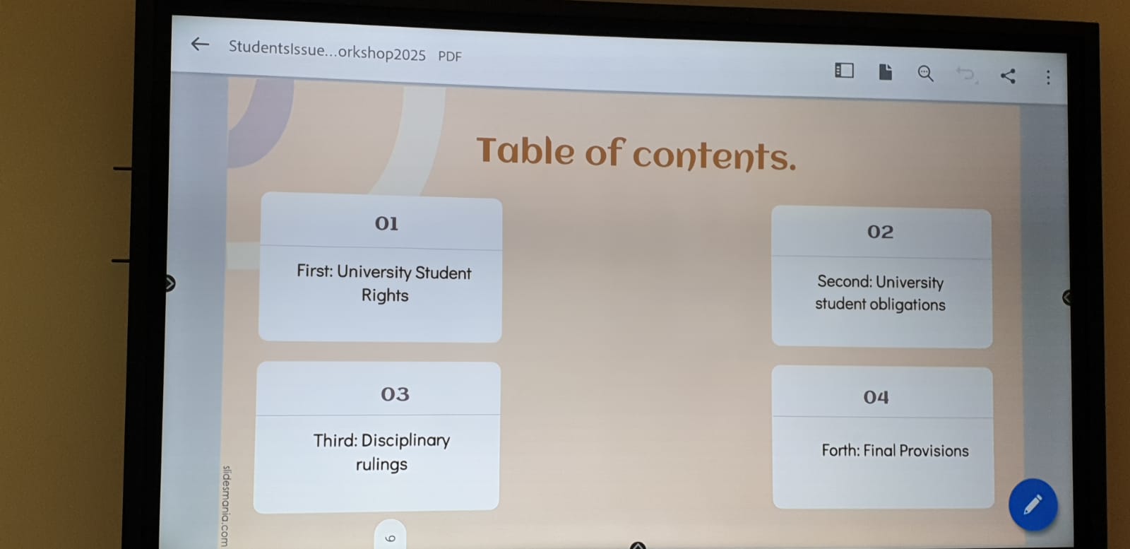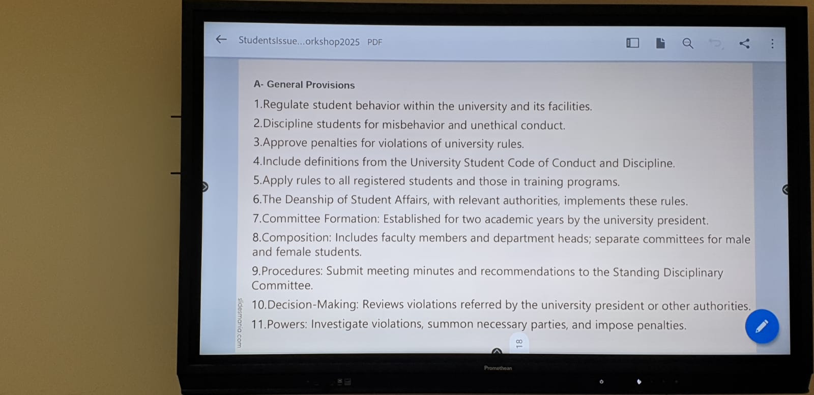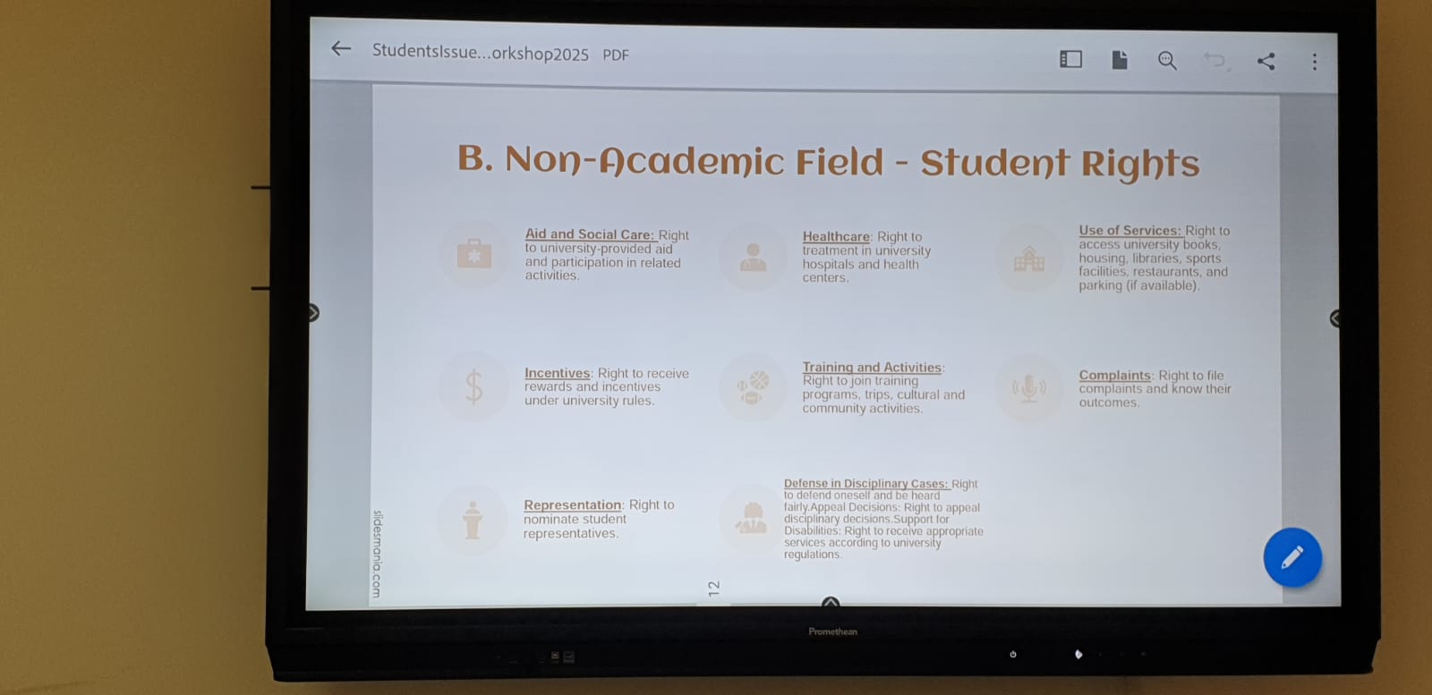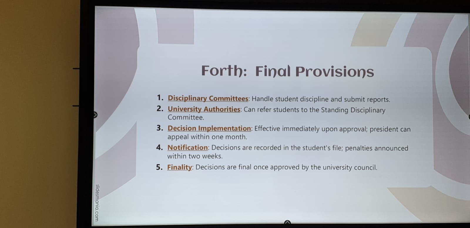 قدّمت الورشة شرحًا وافيًا للوائح والسياسات التأديبية المطبقة على طلاب جامعة الأمير سطام بن عبد العزيز. وتم تعريف المشاركين بمفاهيم رئيسية، بما في ذلك تعريفات "حقوق الطلاب" و"التزاماتهم" و"المخالفات" و"العقوبات"، كما حددتها الجامعة. وأكدت الجلسة على أهمية الالتزام بالمسؤوليات الأكاديمية وغير الأكاديمية، مع تسليط الضوء على الحقوق المكفولة للطلاب لضمان بيئة تعليمية داعمة. وتم شرح دور لجنة التأديب الطلابي بوضوح، بالإضافة إلى الصلاحيات المخولة لمجلس الجامعة لتفسير اللوائح. وقد ساهمت هذه الورشة في تعزيز وعي الطلاب بواجباتهم وحقوقهم، وإعدادهم للمساهمة الإيجابية في مجتمع الجامعة من خلال السلوك المسؤول والالتزام بالمعايير المؤسسية.