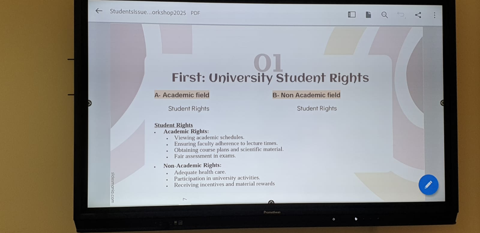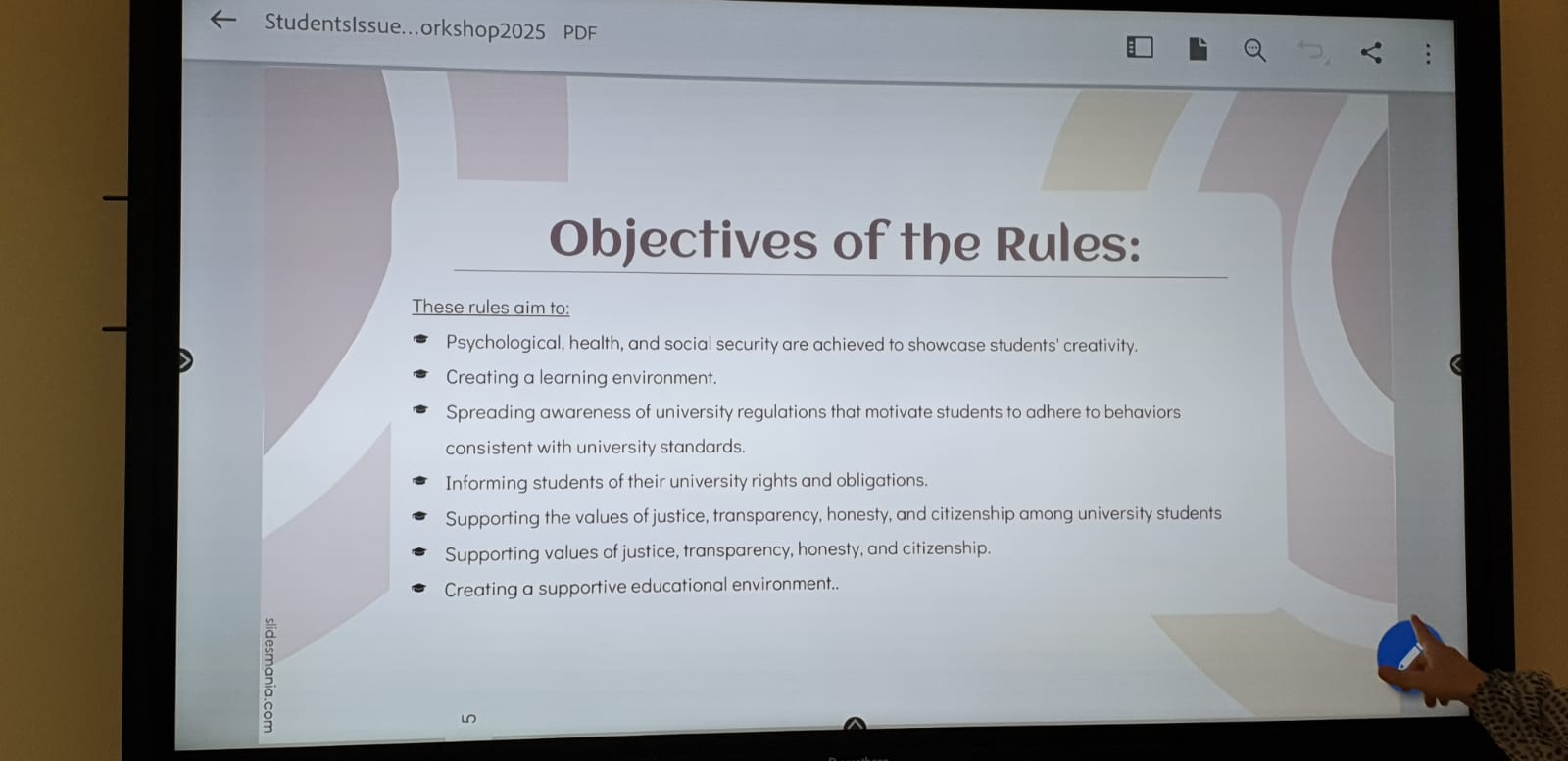 تعريف الطلاب بحقوقهم وواجباتهم الجامعية. ٤. تعزيز قيم العدالة والشفافية والنزاهة والمواطنة لدى طلاب الجامعة