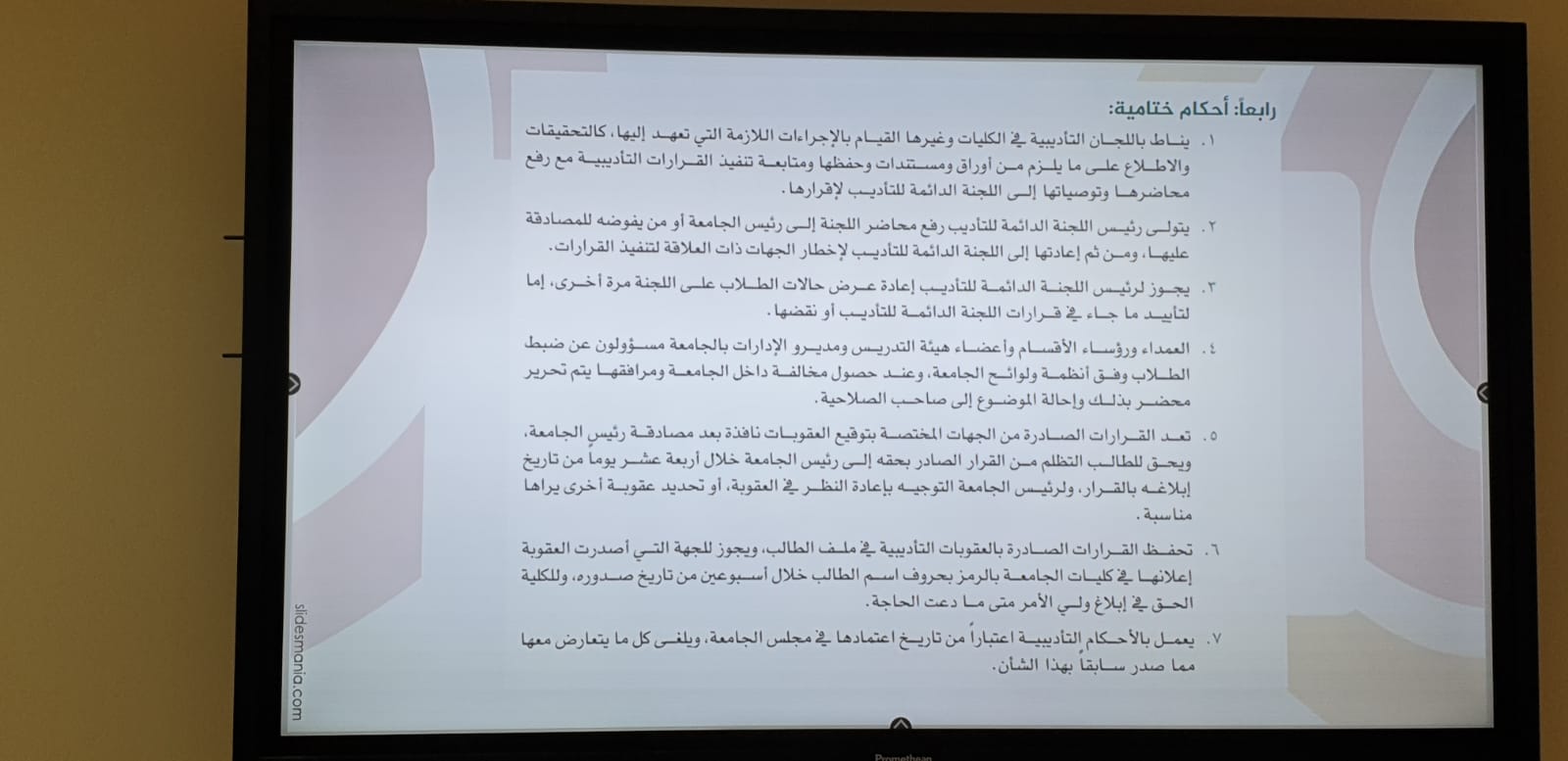 نشر الوعي باللوائح الجامعية التي تحفز الطلاب على الالتزام بسلوكيات تتوافق مع معايير الجامعة.