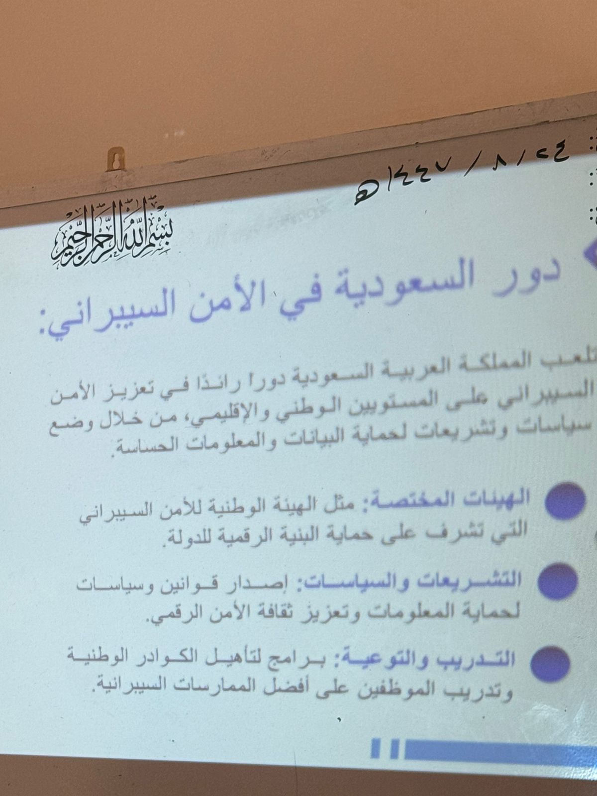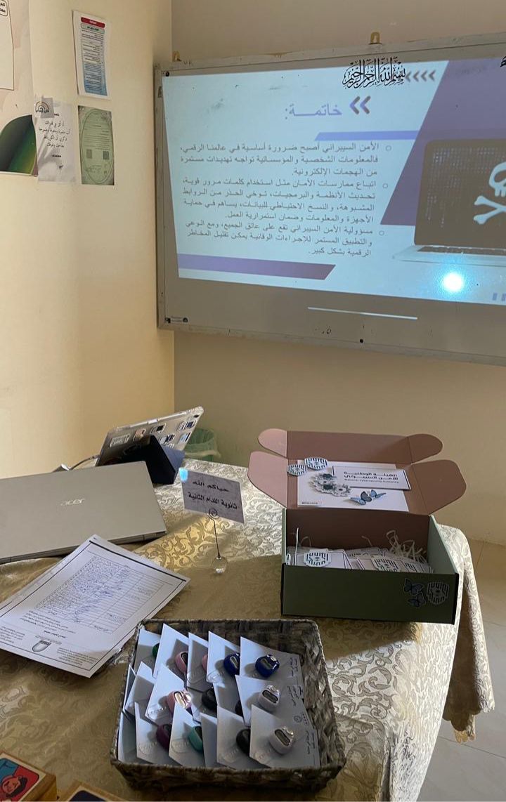 قدمت الطالبات عرضًا توعويًا مميزًا أمام 33 طالبة من المرحلة الثانوية وأعضاء هيئة التدريس بعنوان "أساسيات الأمن السيبراني". تضمن العرض: